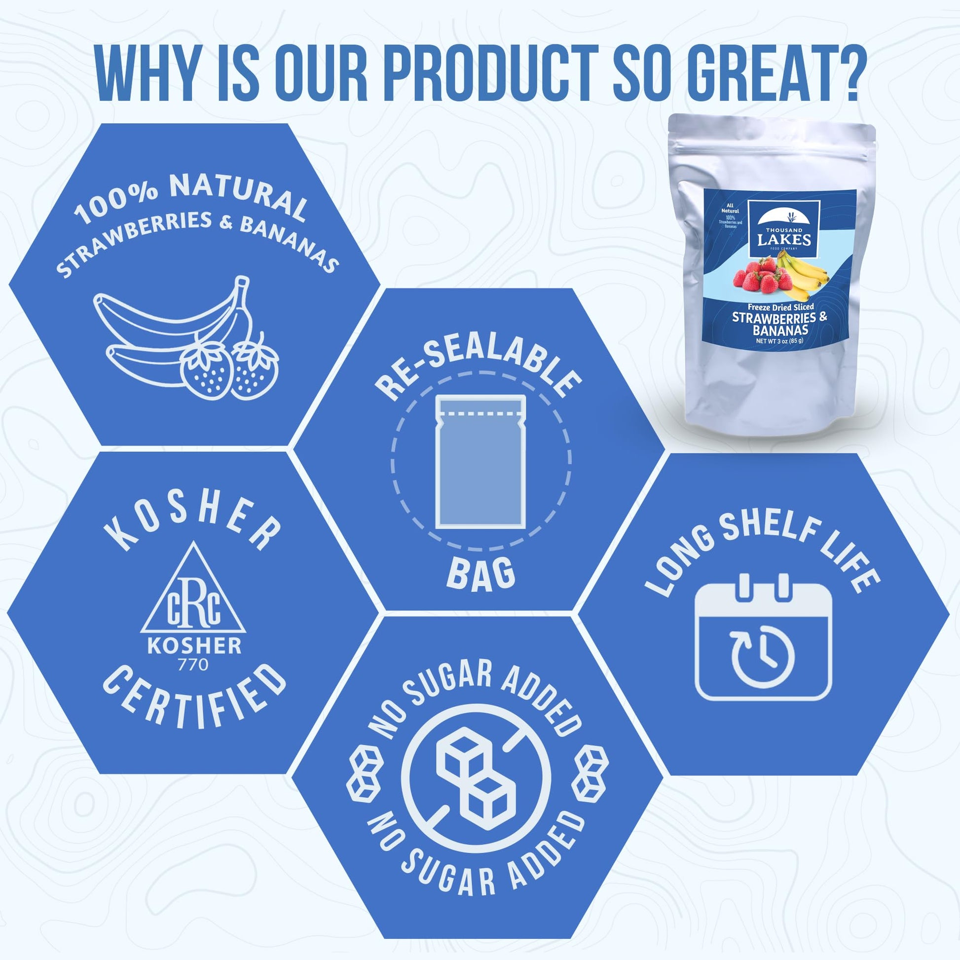 Q: What are the ingredients in Thousand Lakes Freeze Dried Fruit?A: Thousand Lakes Freeze Dried Fruit contains only two ingredients: strawberries and bananas. There are no added sugars, preservatives, or artificial flavors, making it a 100% natural snack.