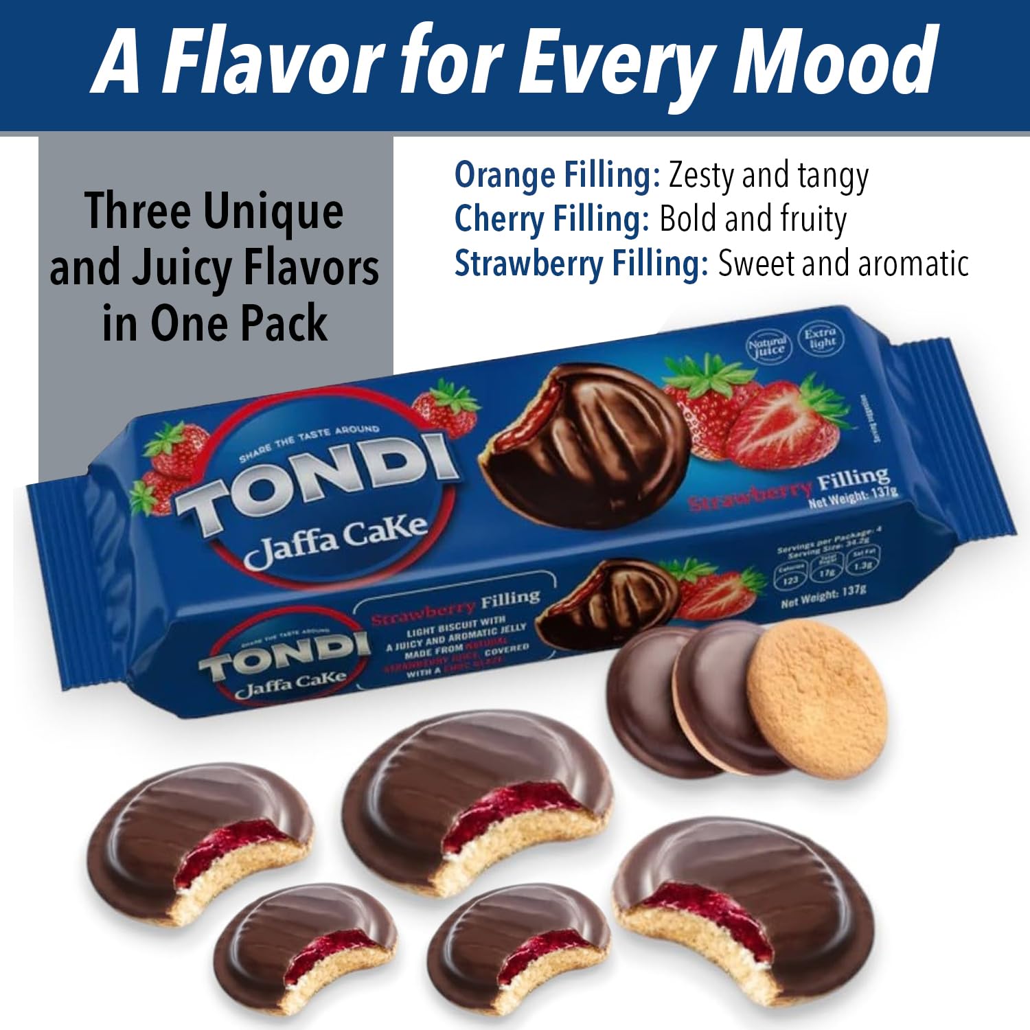 Introducing Tondi'S European Biscuit. Our Cookies Variety Pack Brings You Three Irresistible Flavors&Mdash;Orange, Cherry, And Strawberry. Each Is Carefully Made With A Spongy, Soft Cookies Base And A Luscious, Fruit-Filled Center. These Jaffa Cakes Are Topped With A Rich, Glossy Chocolate Coating. Our Jaffa Cakes Variety Pack Offers A Great Balance Of Flavors, Providing An Ideal Snack Experience. Each Jaffa Cake In This Delightful Variety Pack Features A Unique Fruit Jelly Filling, Offering A Refreshing Burst Of Natural Flavor. The Orange Filling Offers A Tangy Zest, The Cherry Filling A Sweet, Tart Burst, And The Strawberry Filling A Rich, Berry Sweetness. The Jaffa Biscuits And Chewy Fruit Center Create A Satisfying Texture, Perfectly Complemented By The Smooth Chocolate Coating. European Cookies Variety Pack Are Ideal For Gifting Or Special Occasions. Their Elegant, Glossy Appearance And Premium Flavor Make Our Desserts Cookies An Ideal Choice For Birthdays, Holidays, Or Celebrations. These Gourmet Cookies Will Leave A Lasting Impression. These European Biscuits Are Made With High-Quality Ingredients And Traditional Methods. Tondi'S Dedication To Quality And Authenticity Shines Through In Every European Biscuit Cookies, Making It A Great Choice For Anyone Who Appreciates Fine European Confectionery. Tondi'S Cookie Variety Pack Is An Exceptional Snack Or Dessert. Whether You'Re Indulging In The Sweet And Tangy Fruit-Filled Layers Or Savoring The Smooth Chocolate Finish, Each Bite Is A Delightful Experience. These Gourmet Cookies Variety Pack Brings Great European Biscuit-Making To Your Home.