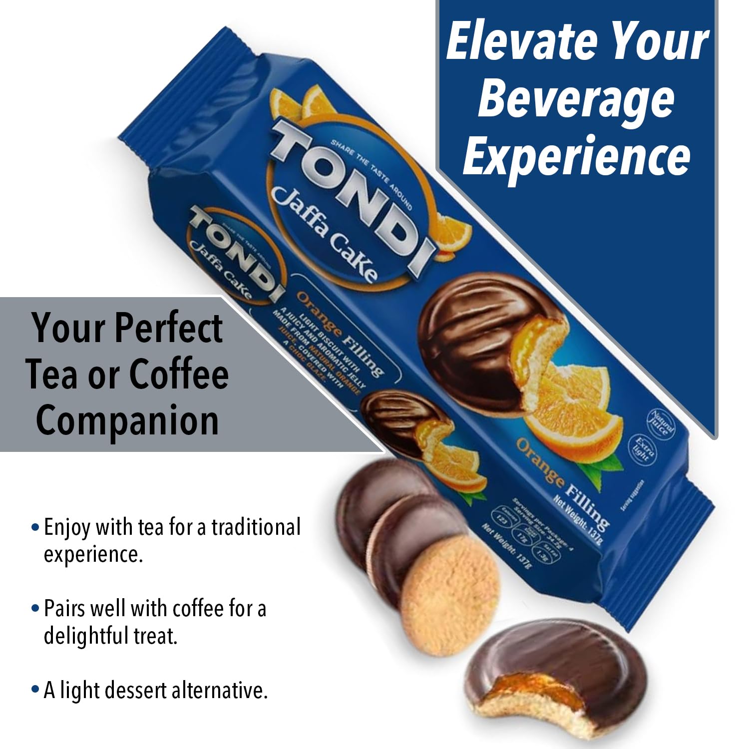 Q: What is the weight of each pack of Tondi Jaffa Cakes?A: Each pack of Tondi Jaffa Cakes in the Variety Pack weighs 137g, providing a satisfying amount for snacking or sharing.