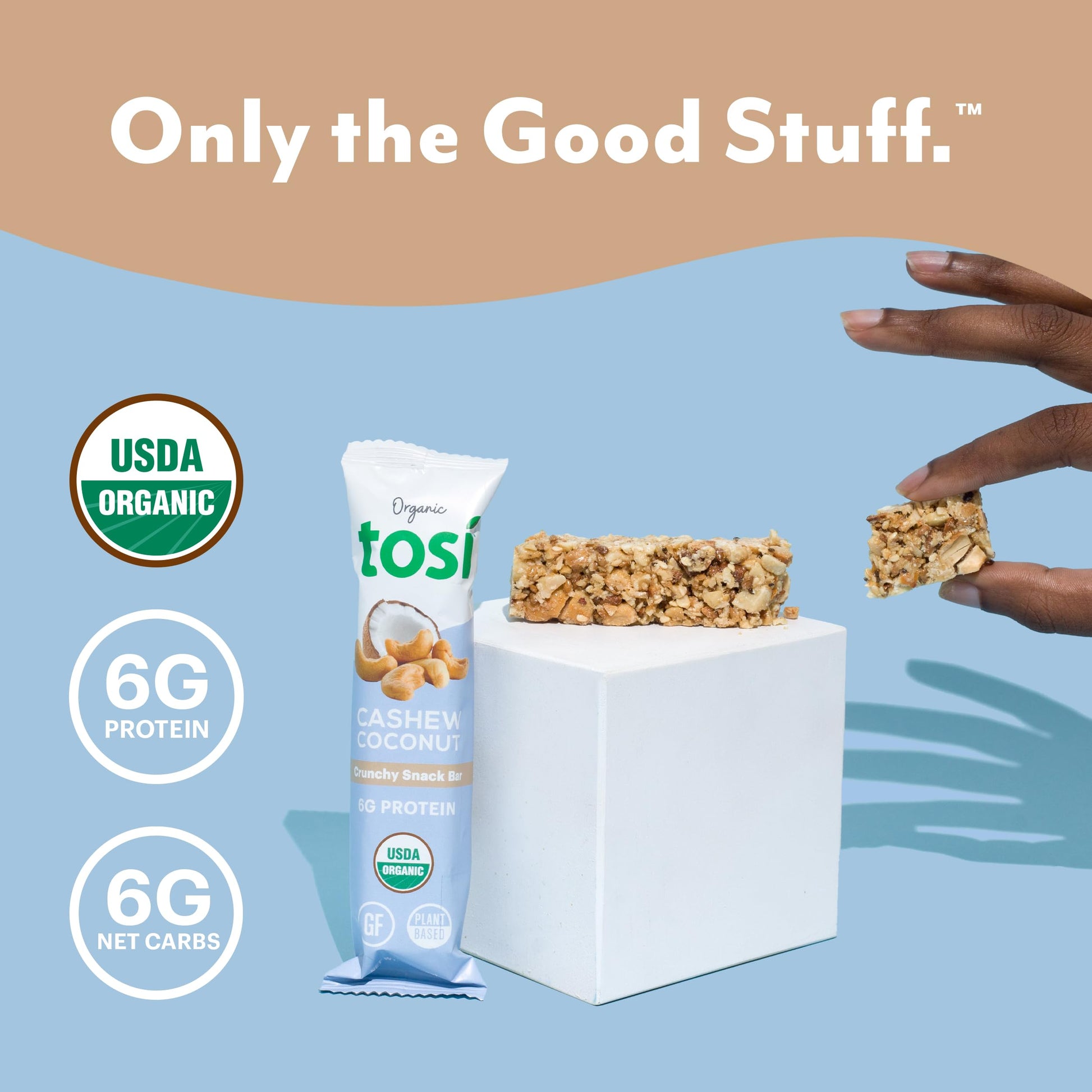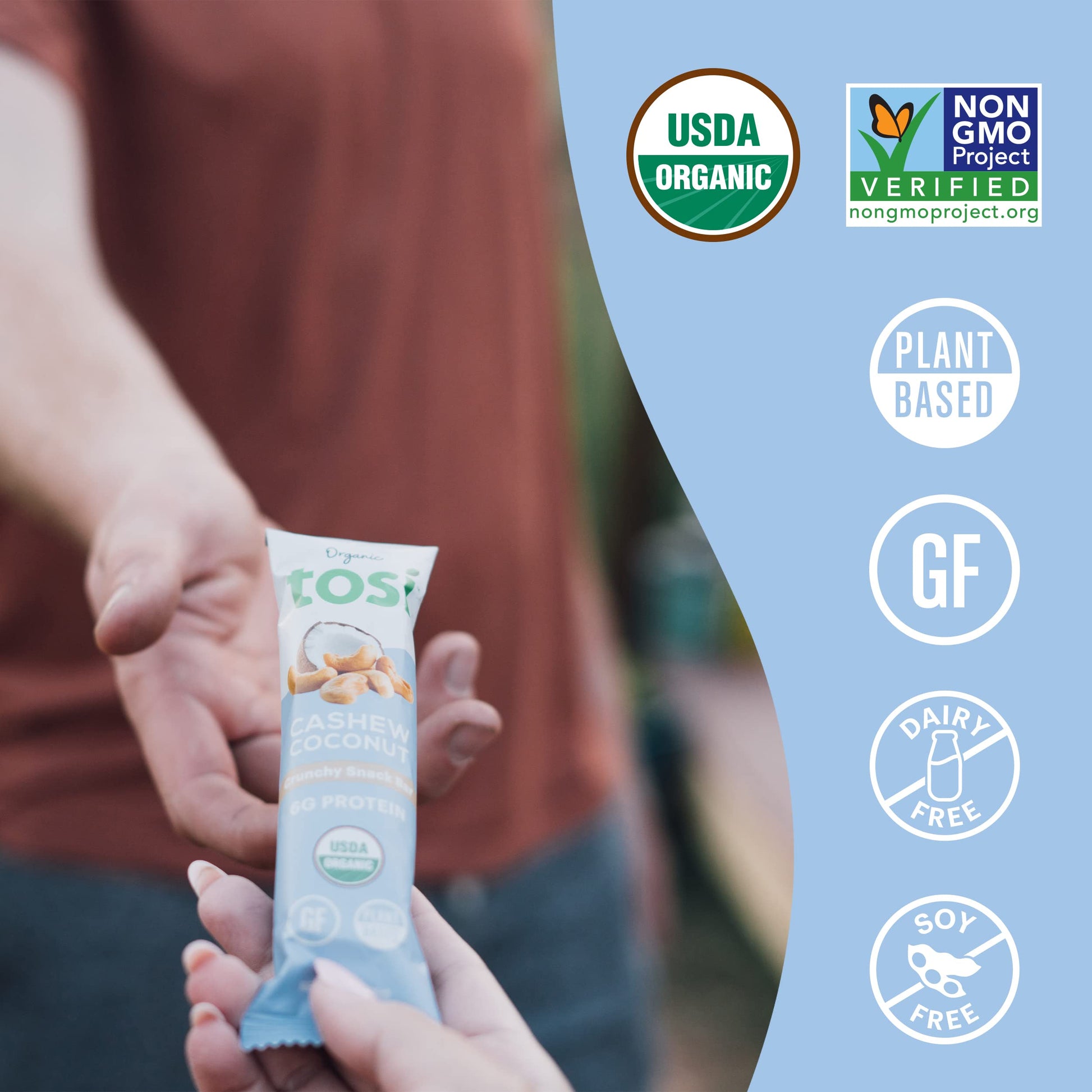 Q: What are Tosi Cashew Coconut Protein Bars made from?A: Tosi Cashew Coconut Protein Bars are made from nutrient-dense organic ingredients, including plant protein from nuts and seeds like chia and flax. They are gluten-free, vegan, and contain no added natural flavors or protein isolates.