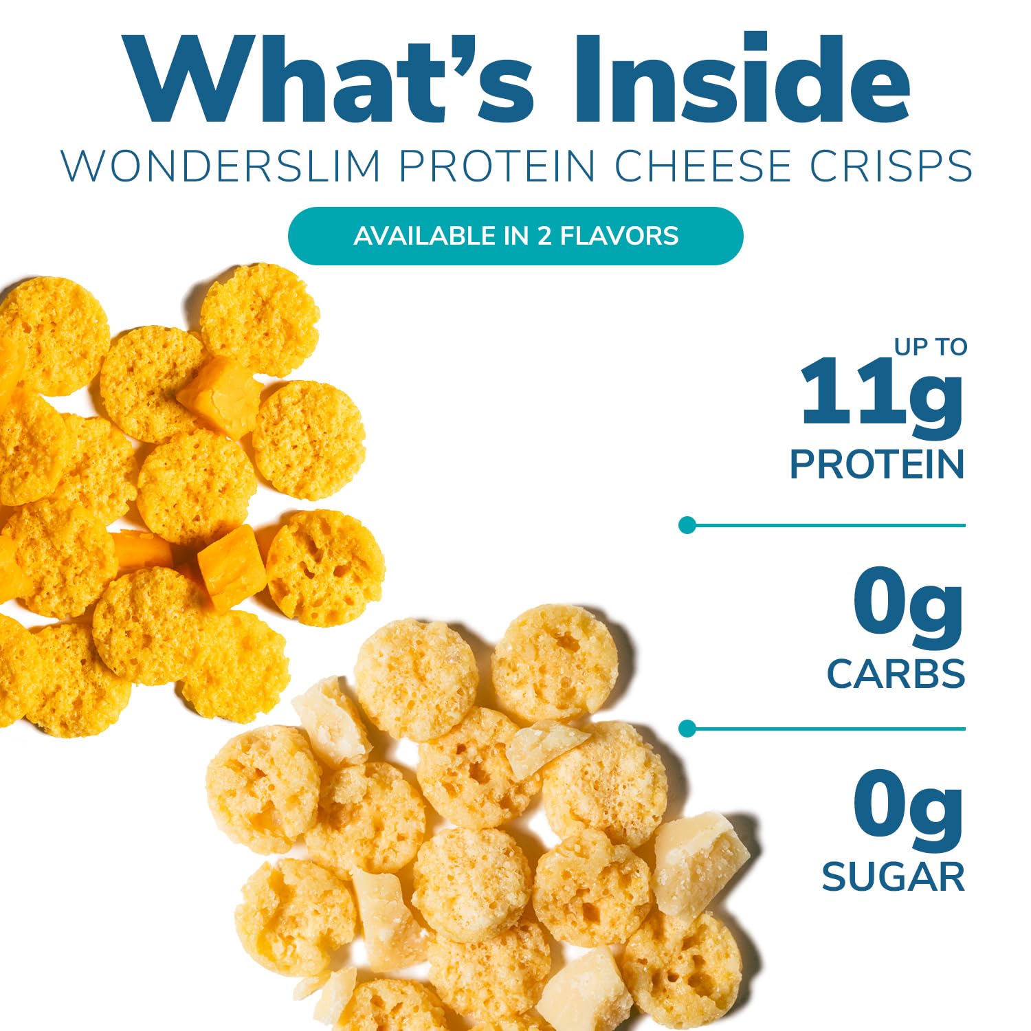 Q: What are Wonderslim Cheese Crisps made from?A: Wonderslim Cheese Crisps are made from 100% real cheese, ensuring a delicious and protein-packed snack option without any added sugars or carbs.