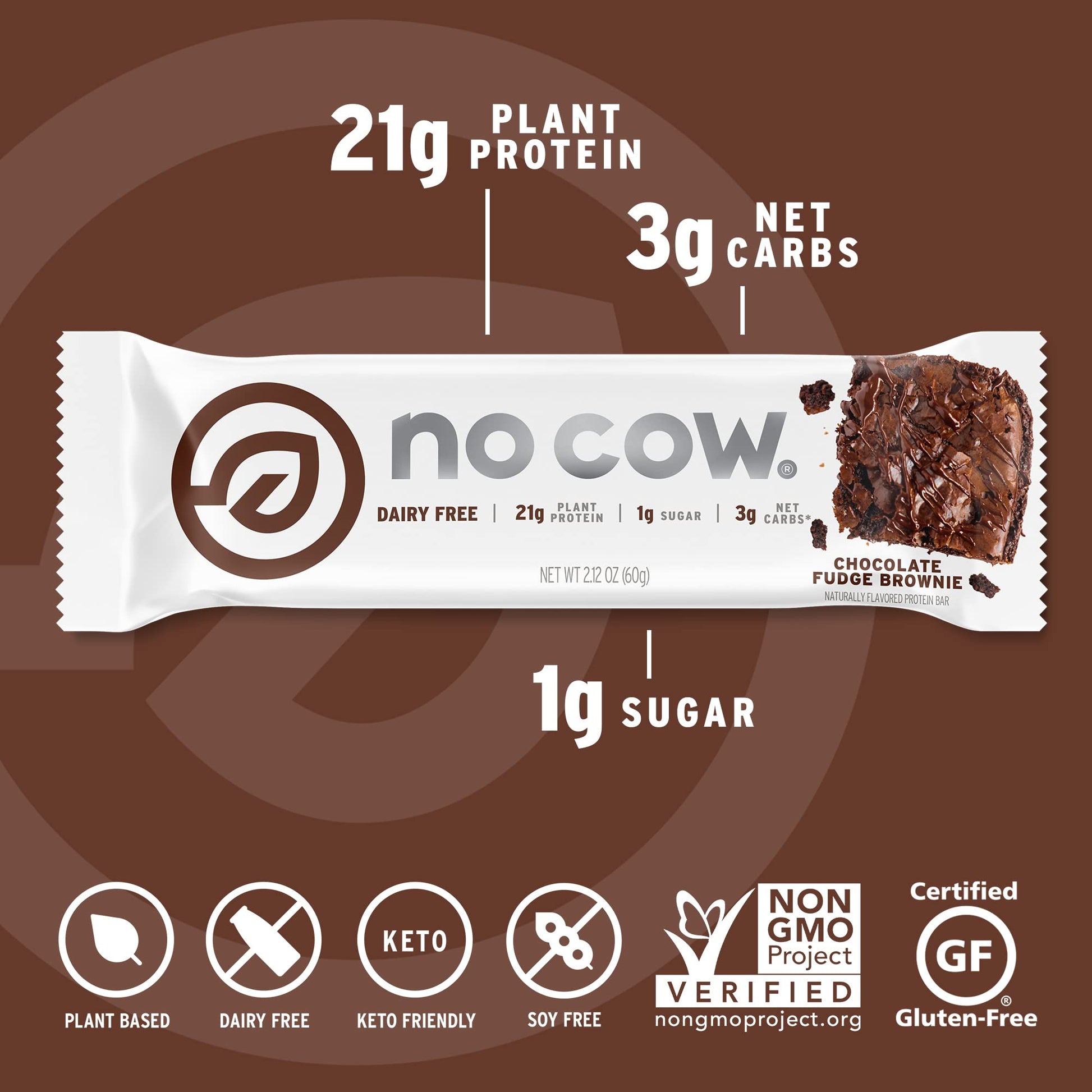 No Cow Protein Bar, Chocolate Fudge Brownie, 20g Plant Based Protein, Low Sugar, Dairy Free, Gluten Free, Vegan, 12 Count
