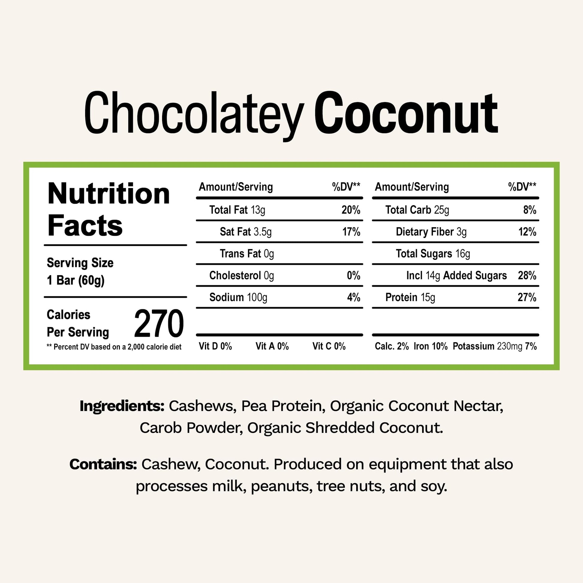 Product DescriptionWe believe life is complicated enough. Our quest with each Rise Bar is that it is made with only the essential ingredients needed to fuel your busy life. Packed with 15 grams of protein, its perfect for breakfast, snacks, pre-workout, post-workout or as a meal replacement. Weve got one of the shortest ingredient list youve ever seen: 5 ingredients are all we need to make the Rise Chocolatey Coconut bar the simplest, most energizing protein bar that never compromises on taste.Every Rise Protein Bar provides slight, delicious variations in each of our health snacks. Were non-GMO project verified, soy free, peanut Free, kosher, grain and gluten Free, and we never use artificial sugars, preservatives or sugar alcohols. The only sugar is derived naturally from coconut nectar (16g), but we do recommend consulting a doctor to find the correct amount of sweetener for your diet.Whether you are on a paleo diet, vegan, celiac, or vegetarian-Rise Bar has something to fit your needs. Rise Bars work best for a diet that is focused on whole ingredients and high protein. There are no artificial sweeteners added, like stevia. Now theres no need for buying giant quantities of bulk vanilla powder from the grocery store for your smoothies. Move faster in the morning with our quick and convenient box full of premier quality bars. The taste is delicious and better than ever, and doesnt taste bland or like chalk. Become a fan of our bars, no matter what your lifestyle!Ingredients: Organic Cashews, Organic Coconut Nectar, Pea Protein Isolate, Carob Powder, Organic Shredded CoconutWith 8 delicious assorted flavors and 5 ingredients or less, each Rise Bar has the nutrition you need without all the extra stuff. All eight of our satisfying flavors are mixed by hand in our very own kitchen. This means each batch is a little different, which makes every bite you take a unique flavor experience. Check out our storefront for more great flavors from Rise!From the ManufacturerWe believe life is complicated enough. Our quest with each Rise Bar is that it is made with only the essential ingredients needed to fuel your busy life. Packed with 15 grams of protein, its perfect for breakfast, snacks, pre-workout, post-workout or as a meal replacement. Weve got one of the shortest ingredient list youve ever seen: 5 ingredients are all we need to make the Rise Chocolatey Coconut bar the simplest, most energizing protein bar that never compromises on taste.Every Rise Protein Bar provides slight, delicious variations in each of our health snacks. Were non-GMO project verified, soy free, peanut Free, kosher, grain and gluten Free, and we never use artificial sugars, preservatives or sugar alcohols. The only sugar is derived naturally from coconut nectar (16g), but we do recommend consulting a doctor to find the correct amount of sweetener for your diet.Whether you are on a paleo diet, vegan, celiac, or vegetarian-Rise Bar has something to fit your needs. Rise Bars work best for a diet that is focused on whole ingredients and high protein. There are no artificial sweeteners added, like stevia. Now theres no need for buying giant quantities of bulk vanilla powder from the grocery store for your smoothies. Move faster in the morning with our quick and convenient box full of premier quality bars. The taste is delicious and better than ever, and doesnt taste bland or like chalk. Become a fan of our bars, no matter what your lifestyle!Ingredients: Organic Cashews, Organic Coconut Nectar, Pea Protein Isolate, Carob Powder, Organic Shredded CoconutWith 8 delicious assorted flavors and 5 ingredients or less, each Rise Bar has the nutrition you need without all the extra stuff. All eight of our satisfying flavors are mixed by hand in our very own kitchen. This means each batch is a little different, which makes every bite you take a unique flavor experience. Check out our storefront for more great flavors from Rise!