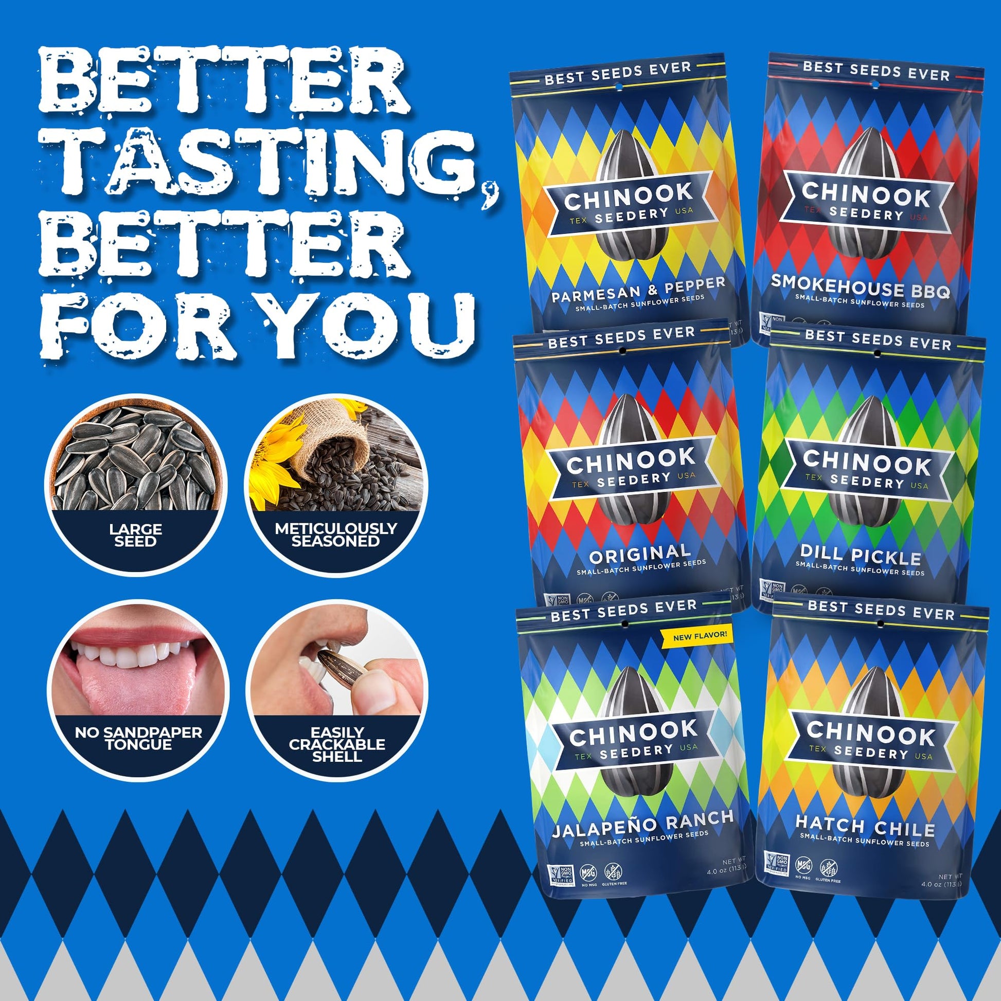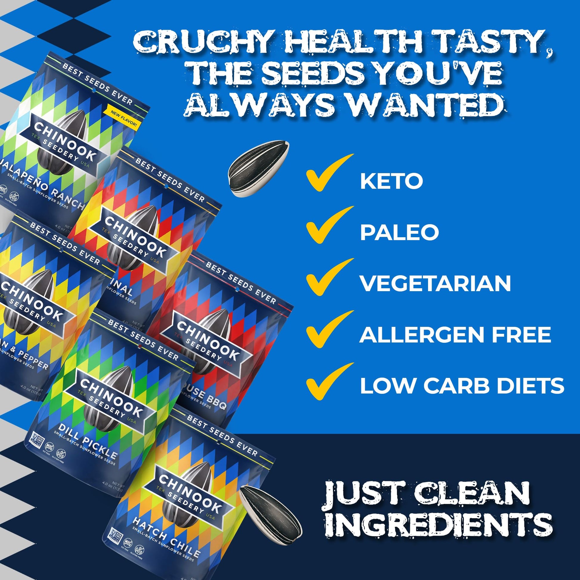Chinook Seeder has a fresh take on the timeless, all-American tradition of eating sunflower seeds. Tastefully salted and uniquely flavored, Chinook's non-GMO verified seeds are better tasting and better for you. Something about the combination of fresh dill pickles and sunflower seeds just seems right. If you cannot stop reaching into the bag for more, you probably shouldn't anyway, because this snack is packed full of nutrients to give you energy and stamina.