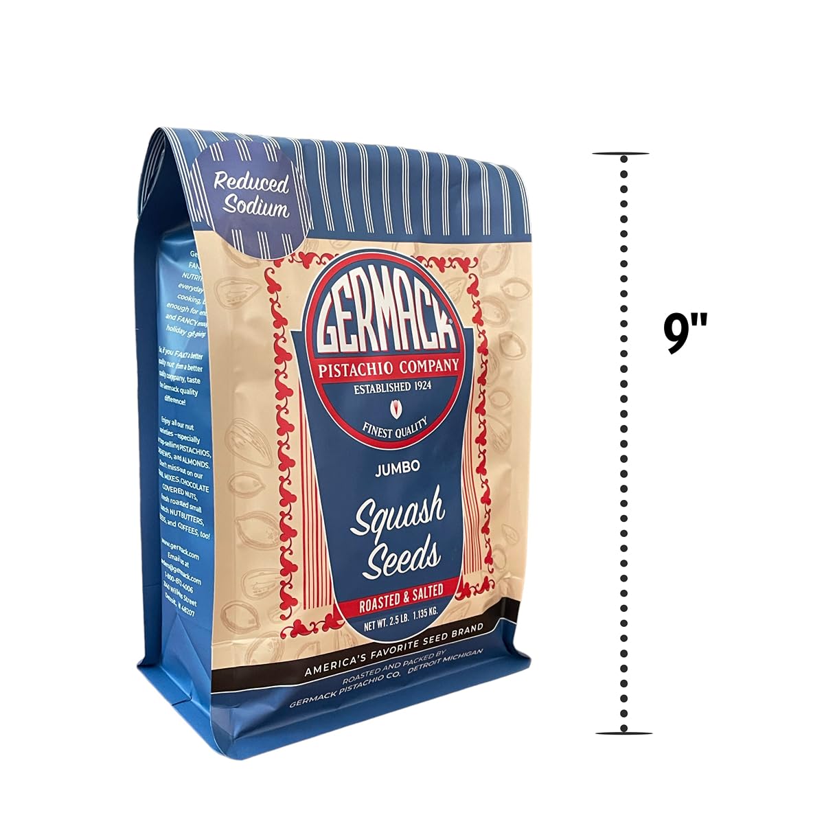 - Q: What are Germack Jumbo Homestyle Squash Seeds? A: Germack Jumbo Homestyle Squash Seeds are reduced sodium, roasted, and lightly salted squash seeds that come in a 2.5-pound classic bag. They are known for their crunchy texture and delicious flavor, making them a satisfying snack.
