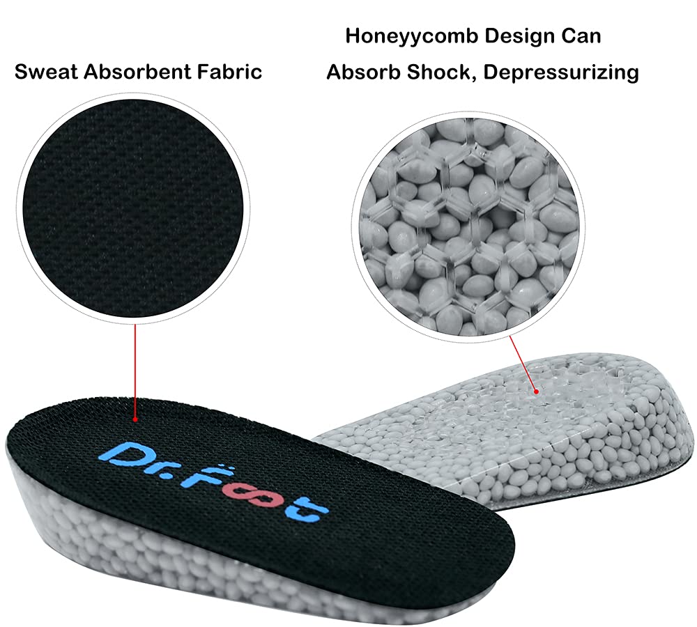 Q: What are Dr. Foot's Height Increase Insoles made of?A: Dr. Foot's Height Increase Insoles are made from soft and durable medical-grade gel material. This high-quality material features a sweat-wicking and anti-slip top layer for enhanced comfort and freshness.