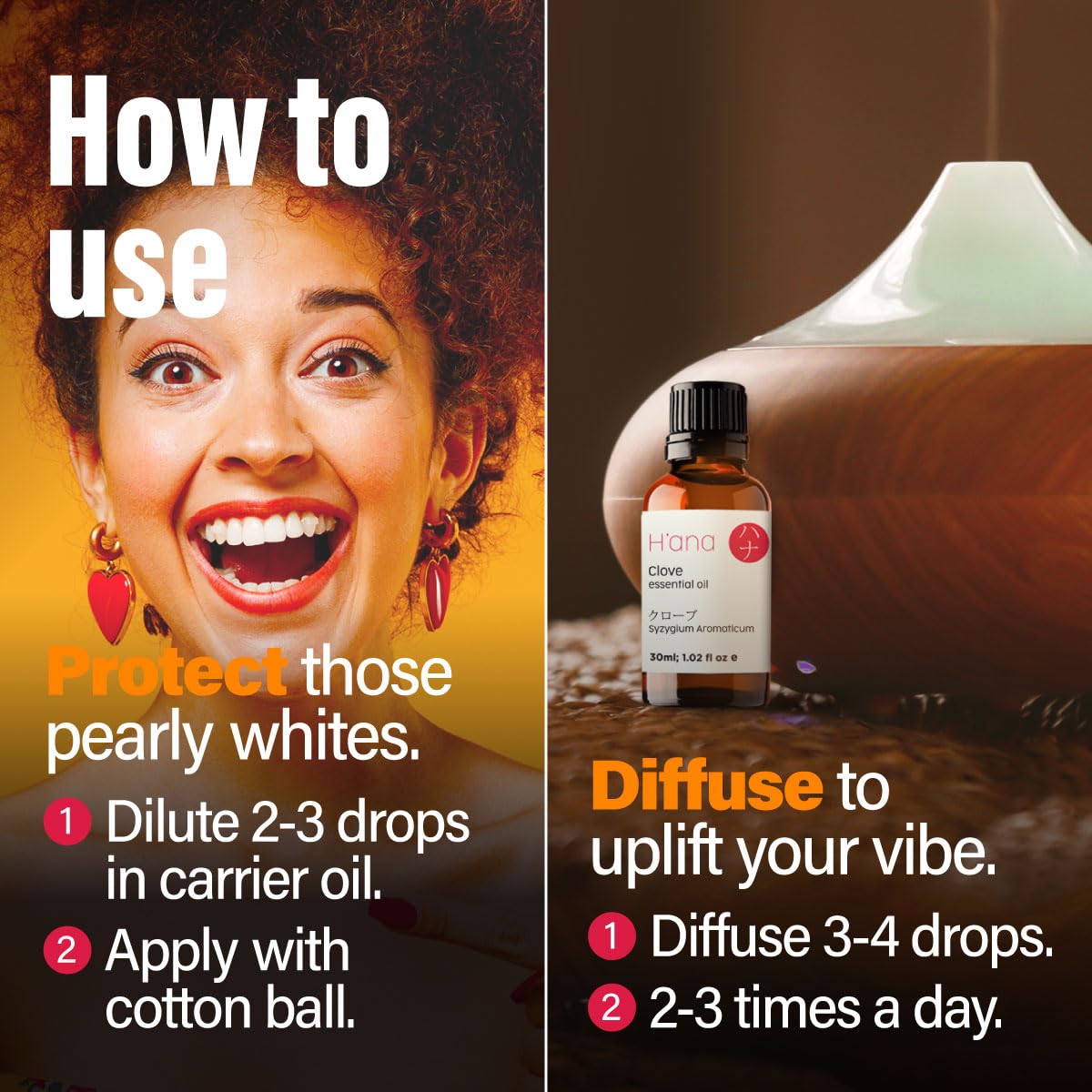 Q: Is H’ana Clove Oil safe for diffusion?A: Absolutely! H’ana Clove Oil is safe for use in diffusers. It is warm and uplifting, making it perfect for creating a calming atmosphere. Just add 3-4 drops to your diffuser for a refreshing scent.