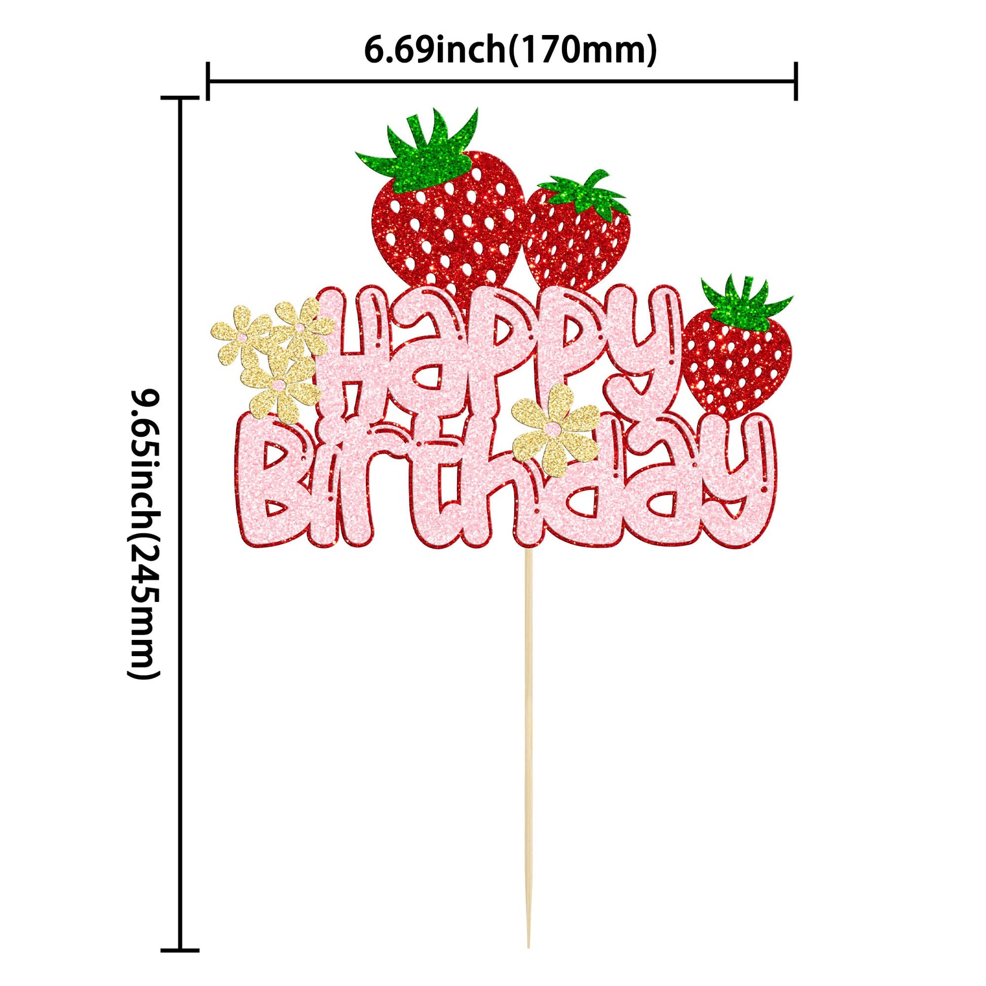 - Q: What is the size of the Strawberry Happy Birthday Cake Topper? A: The Strawberry Happy Birthday Cake Topper measures approximately W 6.7 inches by H 9.4 inches (W 17 cm by H 24 cm), making it an eye-catching addition to your cake or dessert.