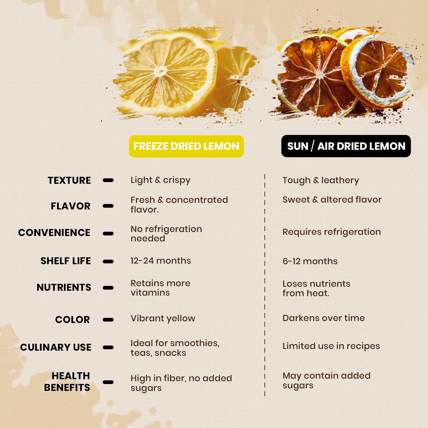 - Q: How can I use freeze-dried lemon slices in my recipes? A: You can use freeze-dried lemon slices in a variety of ways, such as adding them to hot teas for a zesty flavor, infusing water for a refreshing drink, garnishing cocktails, or incorporating them into baking recipes for enhanced citrus taste.