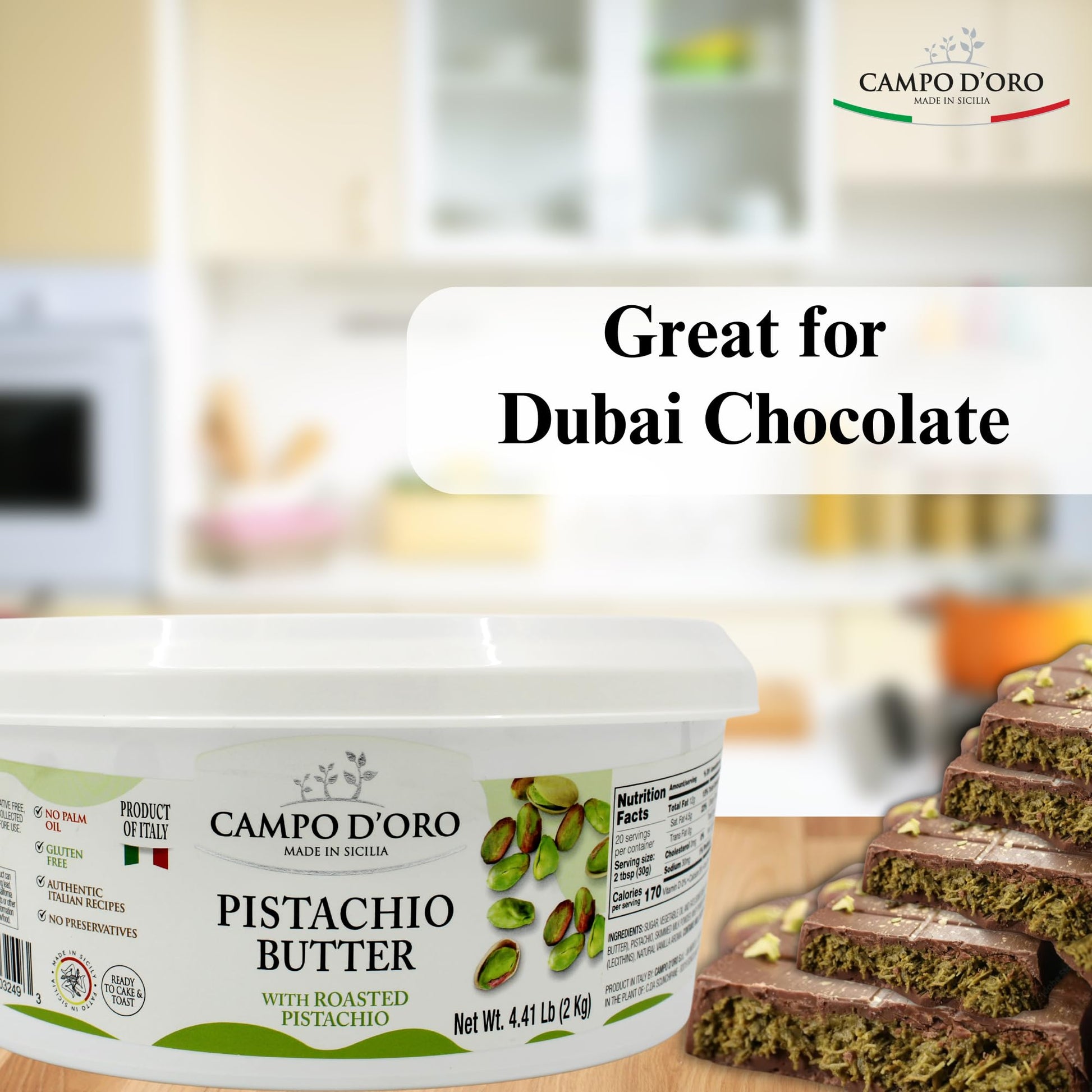 - Q: What can I use CAMPO D'ORO Pistachio Butter Cream for? A: CAMPO D'ORO Pistachio Butter Cream is versatile and can be used as a spread on toast and croissants, a filling for desserts like knafeh and cakes, or blended into gelato. It's perfect for enhancing ice cream sundaes or drizzling over pancakes for a gourmet touch.