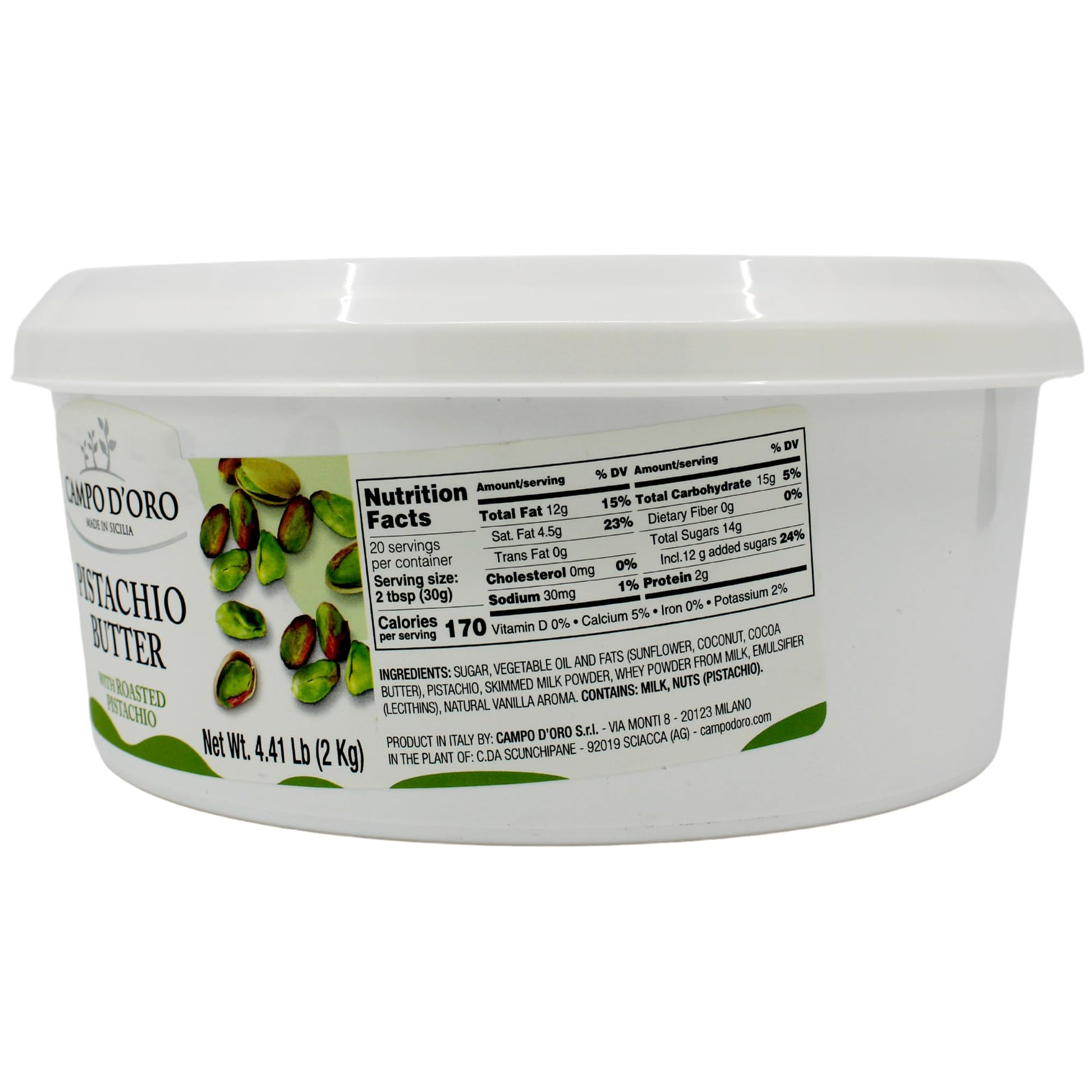 - Q: What are the ingredients in CAMPO D'ORO Pistachio Butter Cream? A: The main ingredient is premium Sicilian pistachios, crafted into a sweet, spreadable cream. This authentic Italian pistachio butter is made without any artificial additives, ensuring a rich and natural flavor.