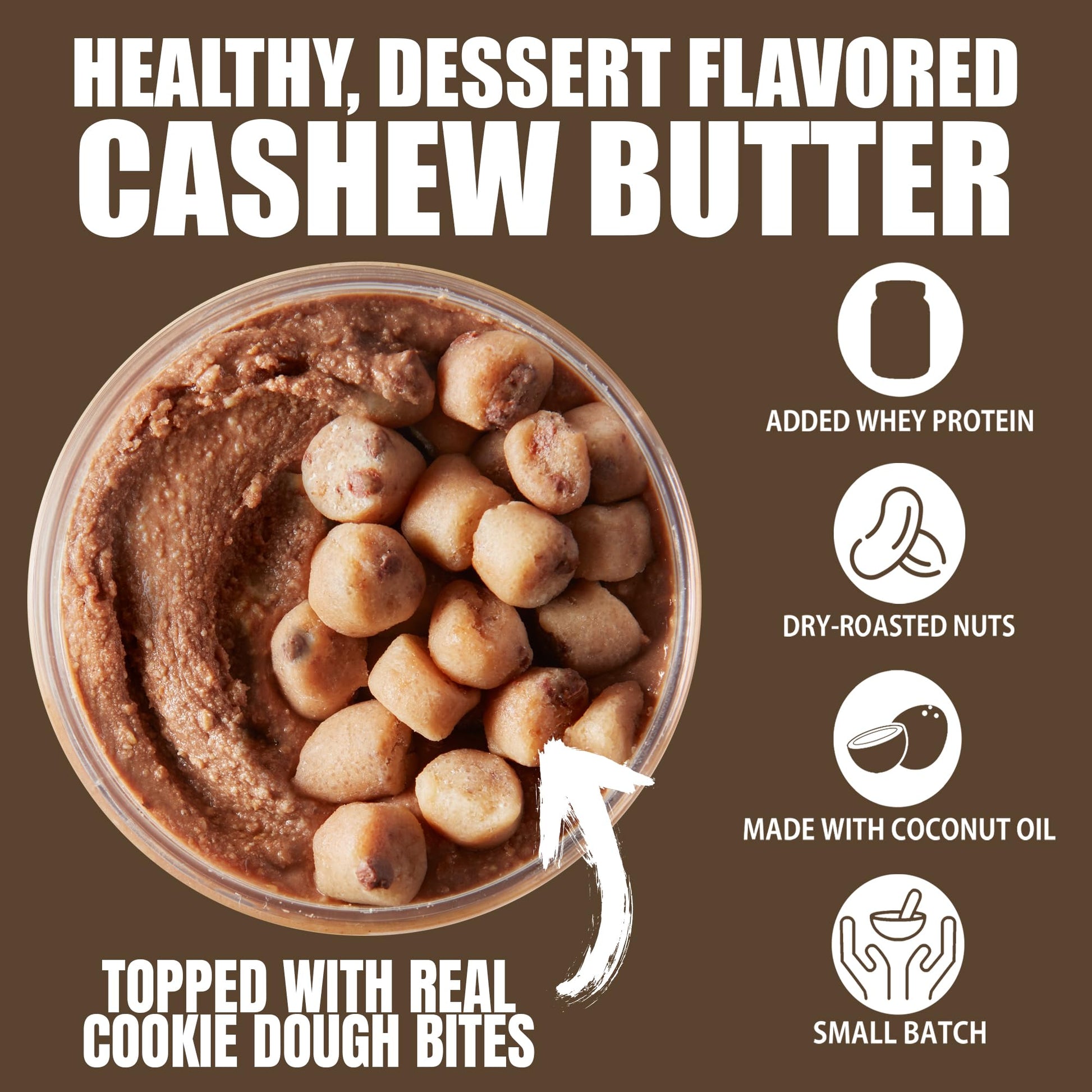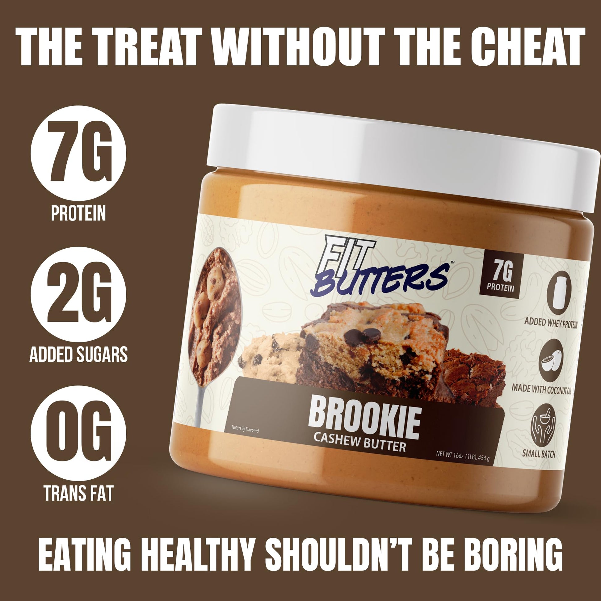 - Q: What makes Fit Butters Brookie Cashew Butter different from regular nut butters? A: Fit Butters Brookie Cashew Butter stands out due to its unique brownie and cookie dough flavor combination, dry roasted cashews for a richer taste, and the addition of whey protein isolate for a complete protein source. This nut butter offers the indulgence of desserts without the added sugars, making it a healthier choice.