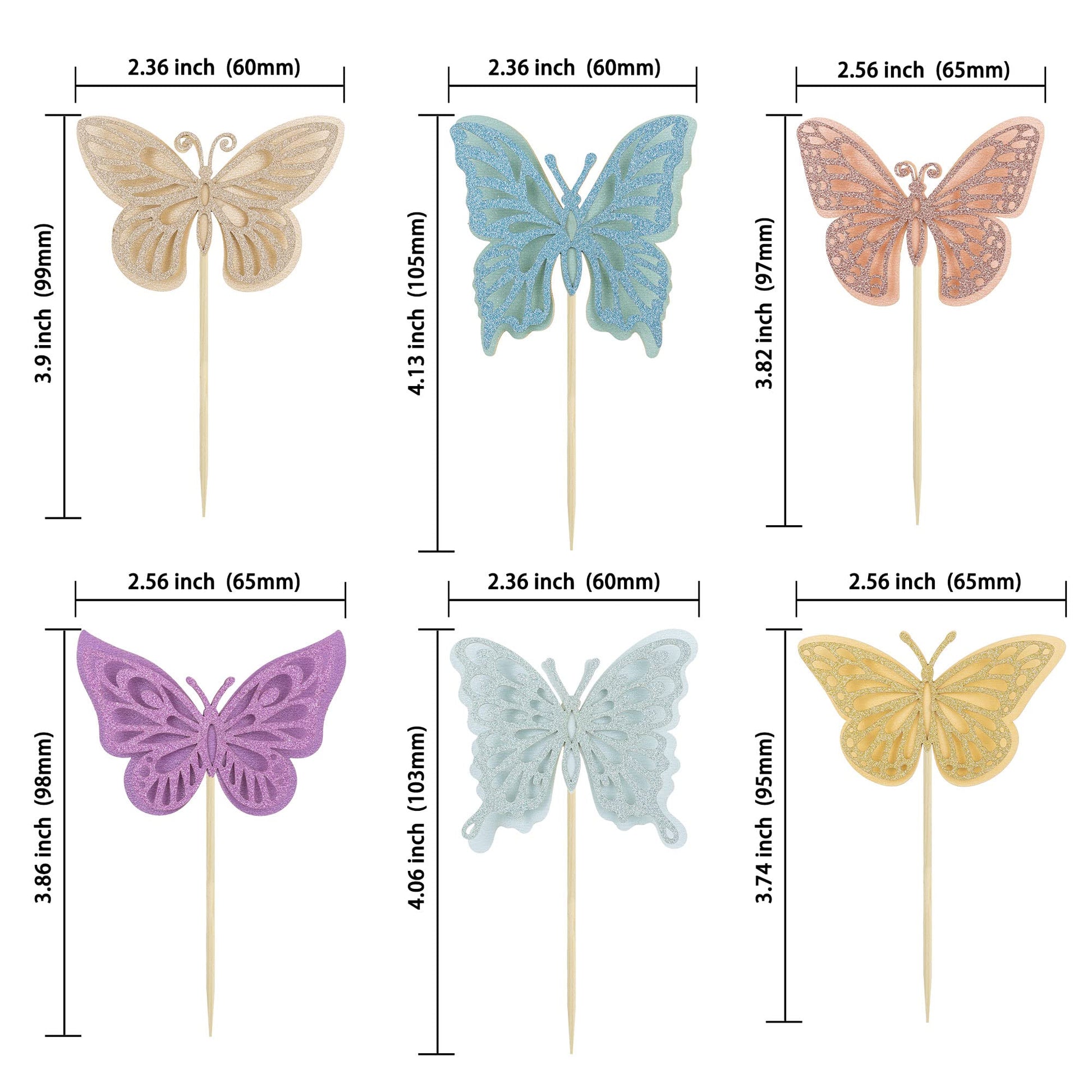 - Q: What are the dimensions of the Gyufise Butterfly Cupcake Toppers? A: Each butterfly cupcake topper measures approximately 2.6 inches wide by 4.9 inches high (6.5 cm by 12.4 cm including the stick), making them a perfect size for decorating cupcakes and cakes.