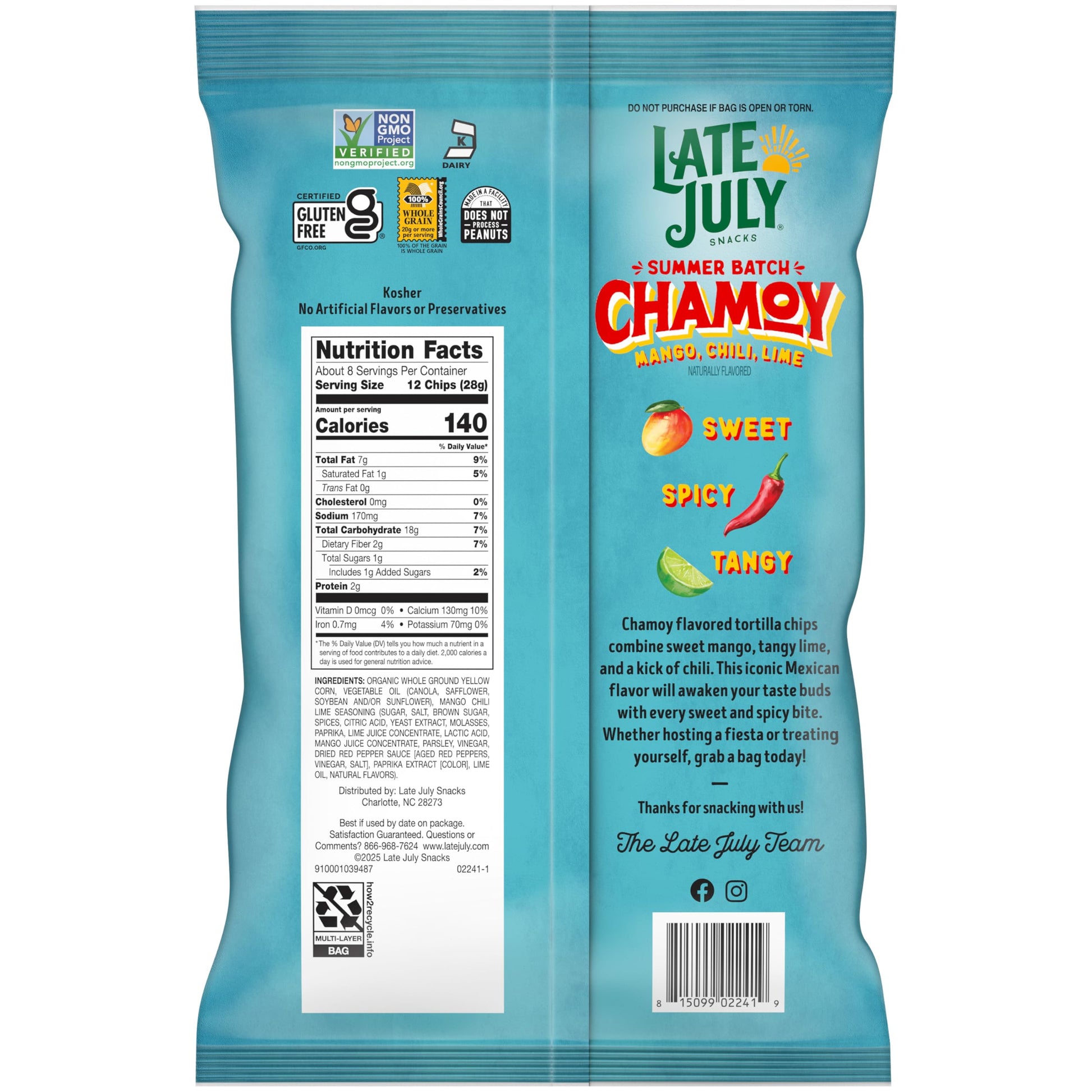 - Q: What are Late July Chamoy Flavored Tortilla Chips made of? A: Late July Chamoy Flavored Tortilla Chips are made with organic and non-GMO ingredients, ensuring a high-quality snack that is both delicious and responsible. They combine the iconic Mexican flavors of sweet mango, tangy lime, and a kick of chili.