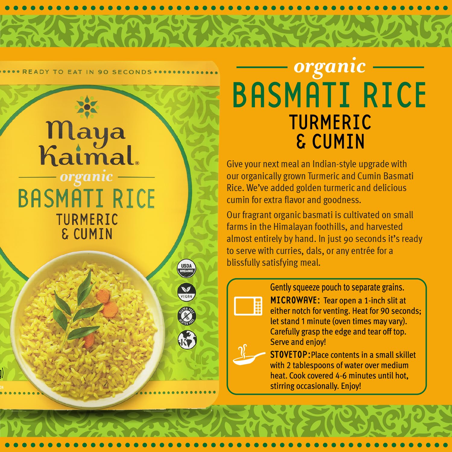 - Q: How do I prepare Maya Kaimal's Turmeric and Cumin Surekha Rice? A: This rice is fully cooked and can be microwaved for quick preparation. Simply heat it for 90 seconds, and it's ready to serve as a perfect accompaniment to your favorite Indian dishes or any meal.