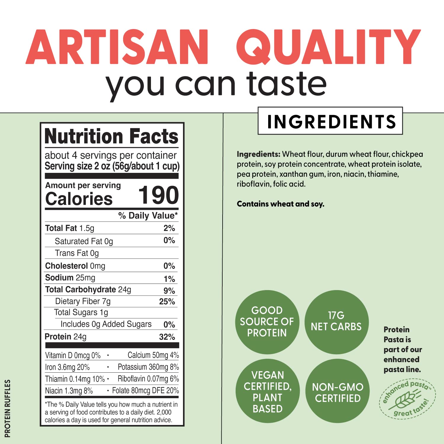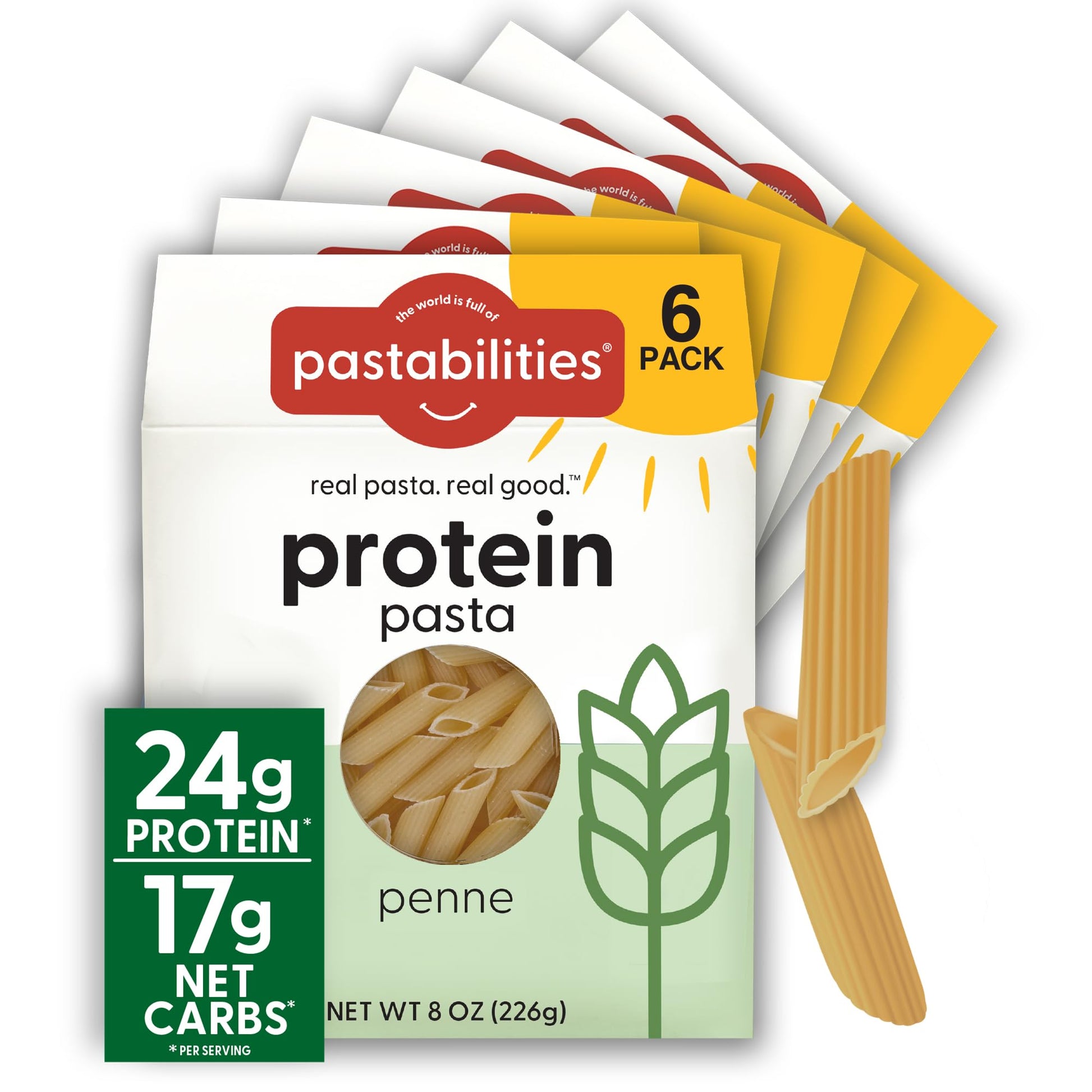 - Q: What makes Pastabilities Protein Pasta different from traditional pasta? A: Pastabilities Protein Pasta offers 24g of protein and only 17g of net carbs per serving, which is significantly higher in protein and lower in carbs compared to traditional pasta, which typically has around 7g of protein and 39g of net carbs. This makes it an excellent choice for those on a low-carb or keto diet.