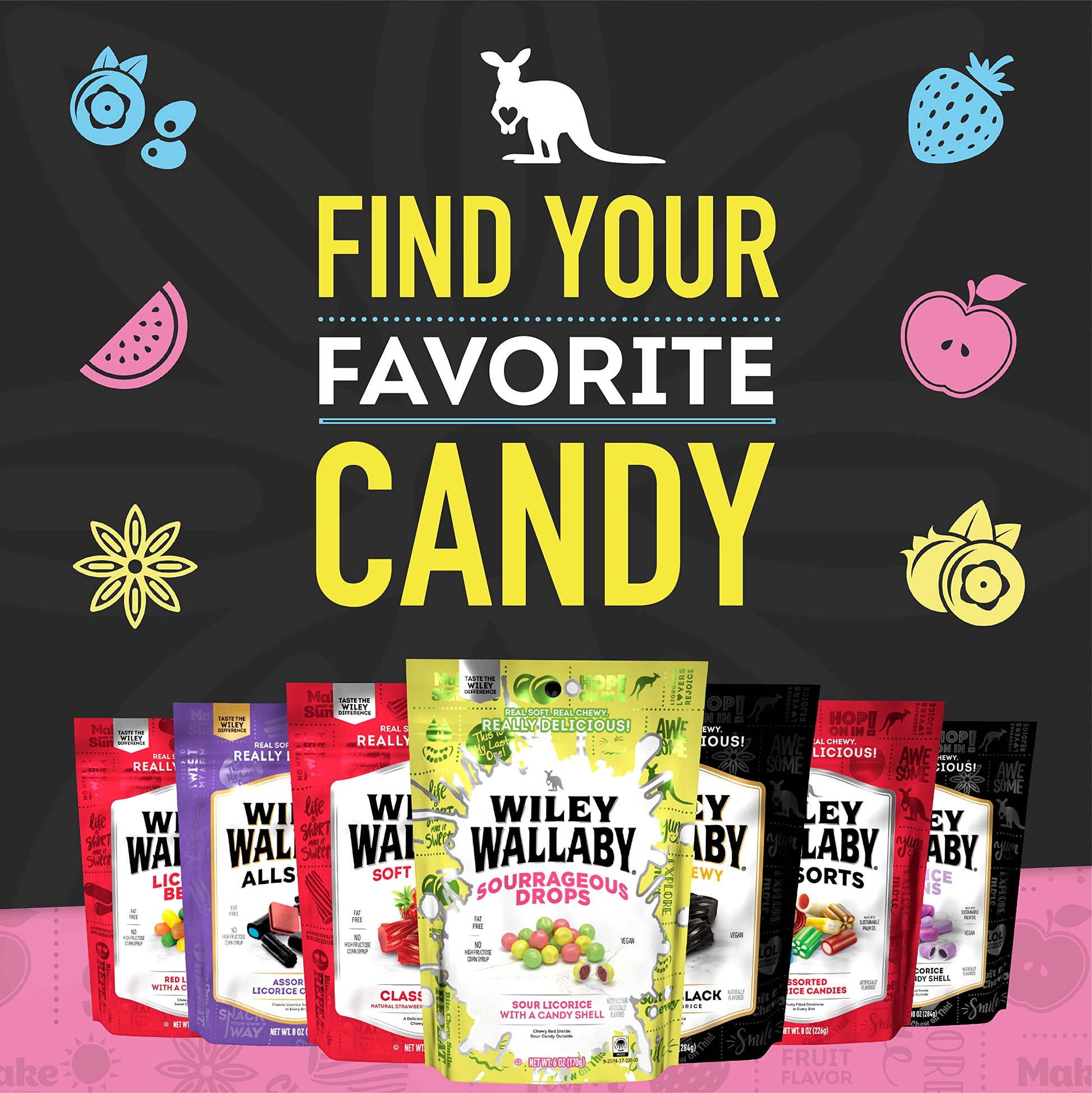 - Q: What makes Wiley Wallaby licorice different from other licorice brands? A: Wiley Wallaby licorice stands out due to its soft and chewy texture combined with big, bold fruit flavors. Unlike many traditional licorice candies, it is made with less sugar, is fat-free, and contains no dairy or high fructose corn syrup, making it a guilt-free treat.