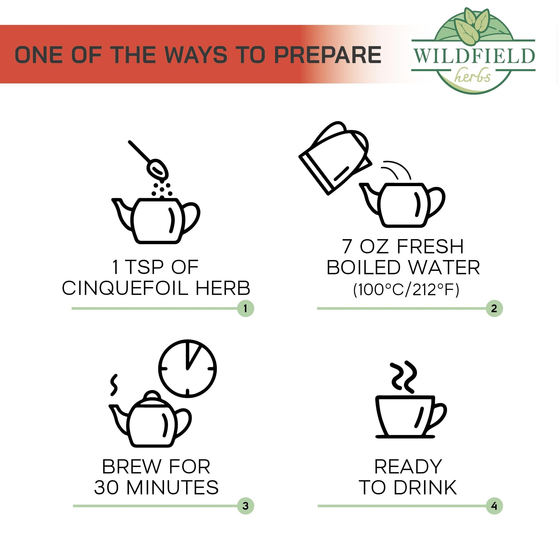 Q: How should I prepare Cinquefoil Herb tea?A: To prepare Cinquefoil Herb tea, steep 1-2 teaspoons of the dried herb in hot water for 5-10 minutes. Adjust the steeping time based on your taste preference for a stronger or milder flavor.