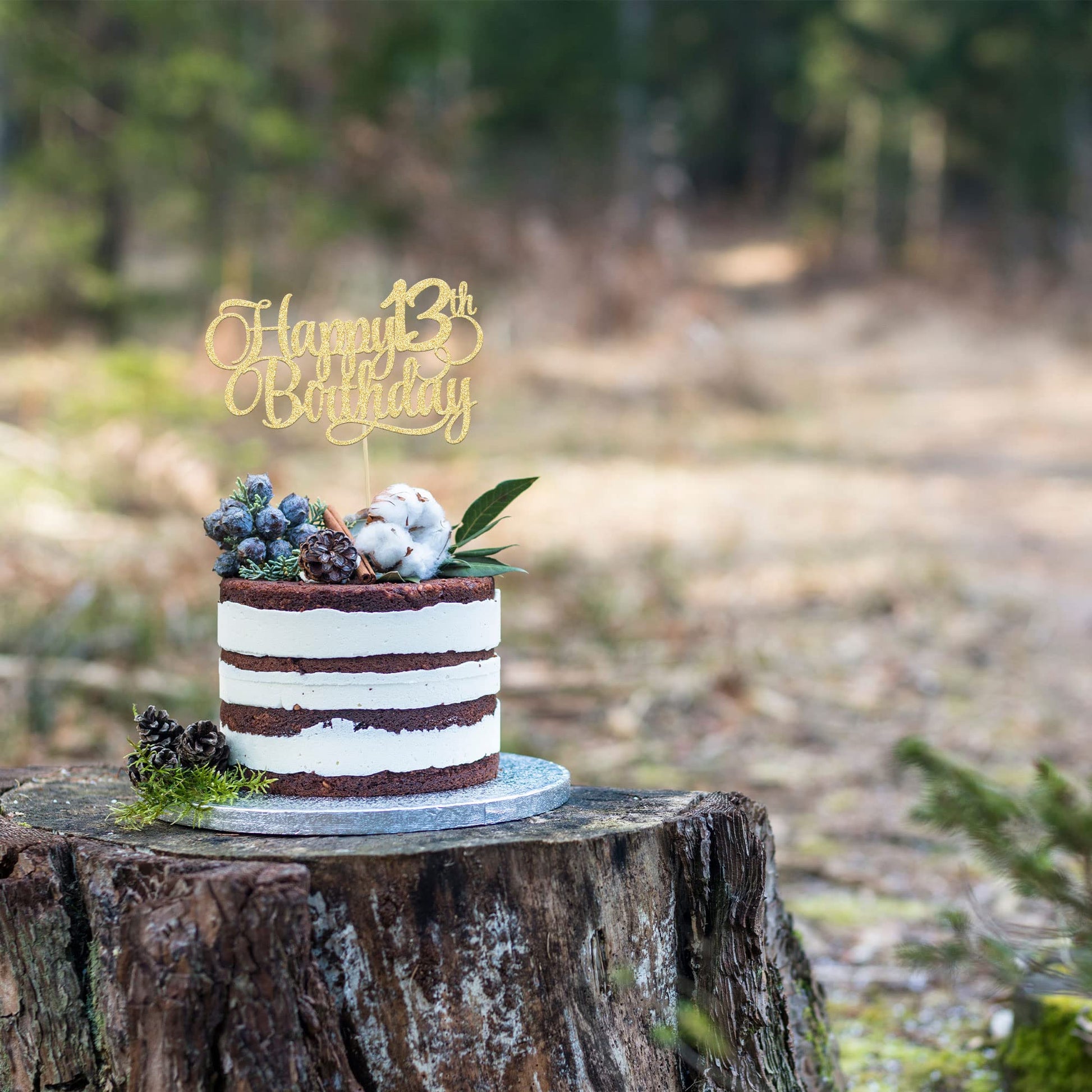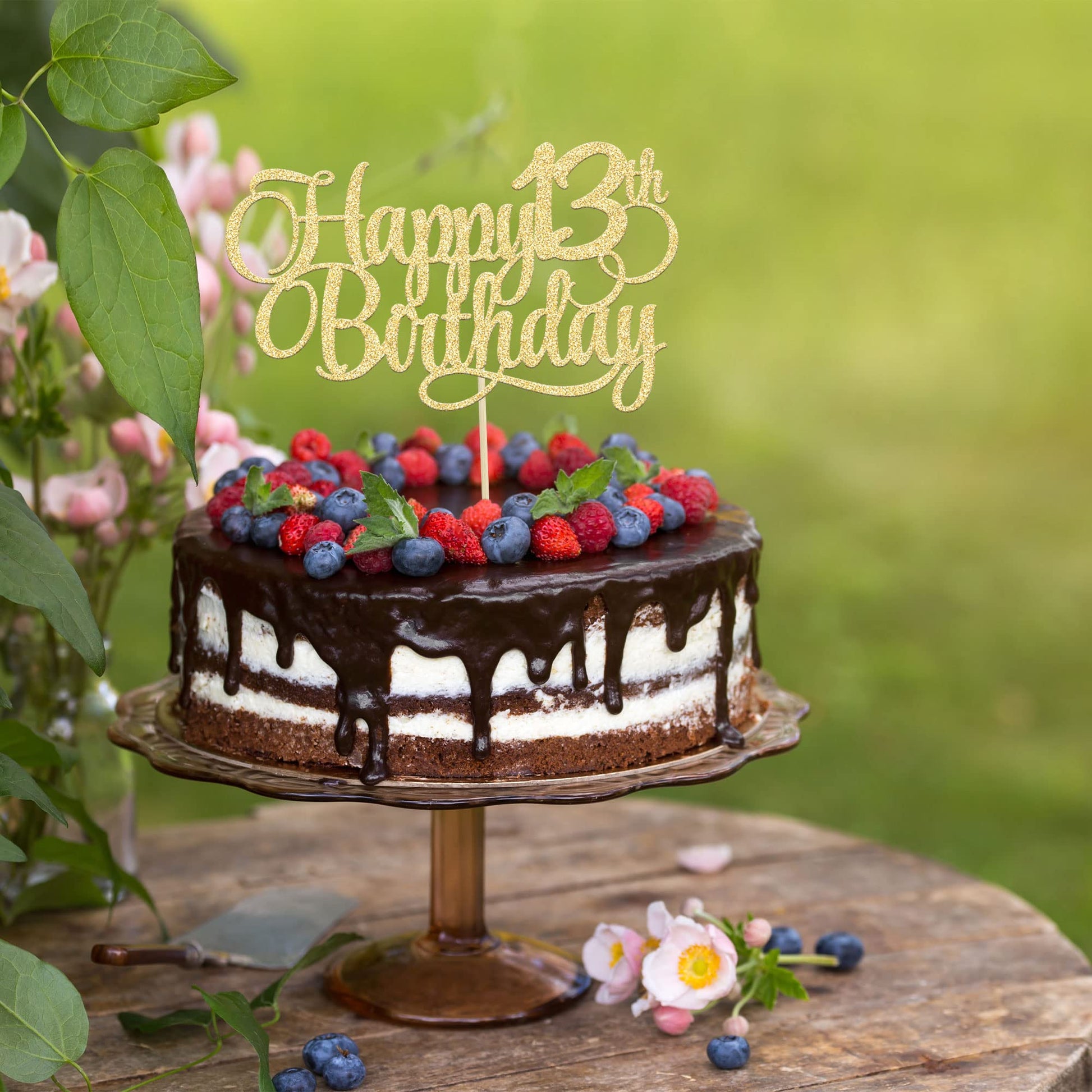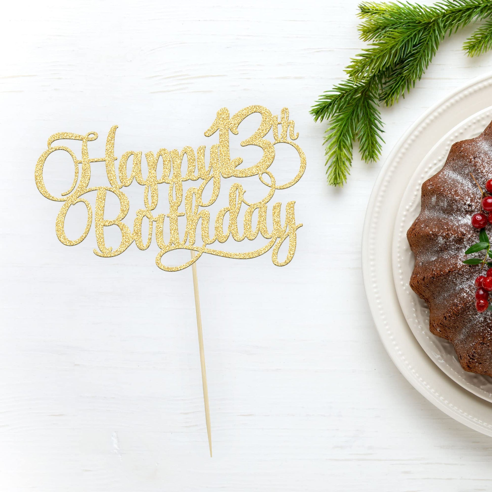 Q: What material is the Happy 13th Birthday Cake Topper made of?A: The Happy 13th Birthday Cake Topper is made of 300 gram glitter card stock and features a 100% food grade bamboo stick, ensuring durability and safety for your cake decorations.