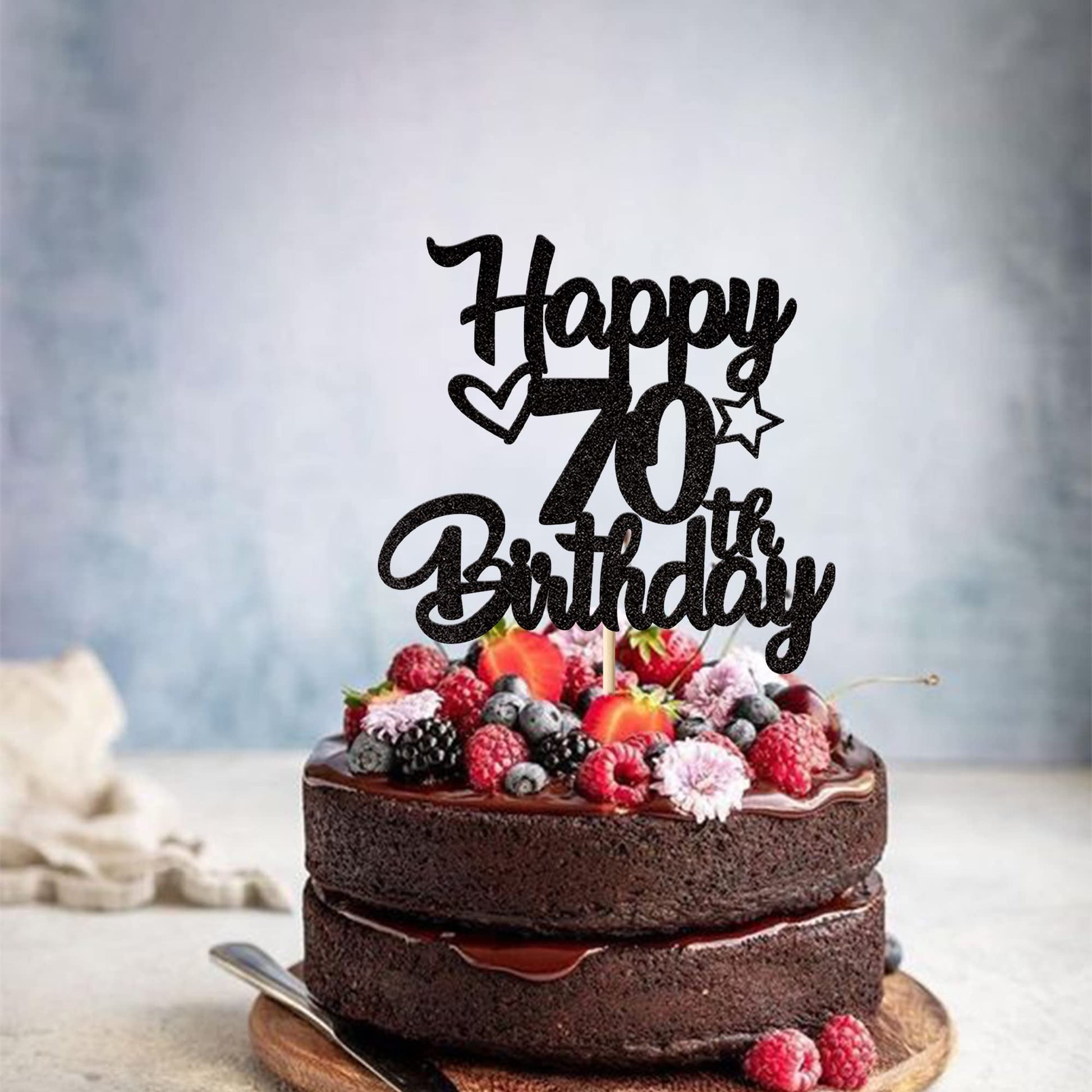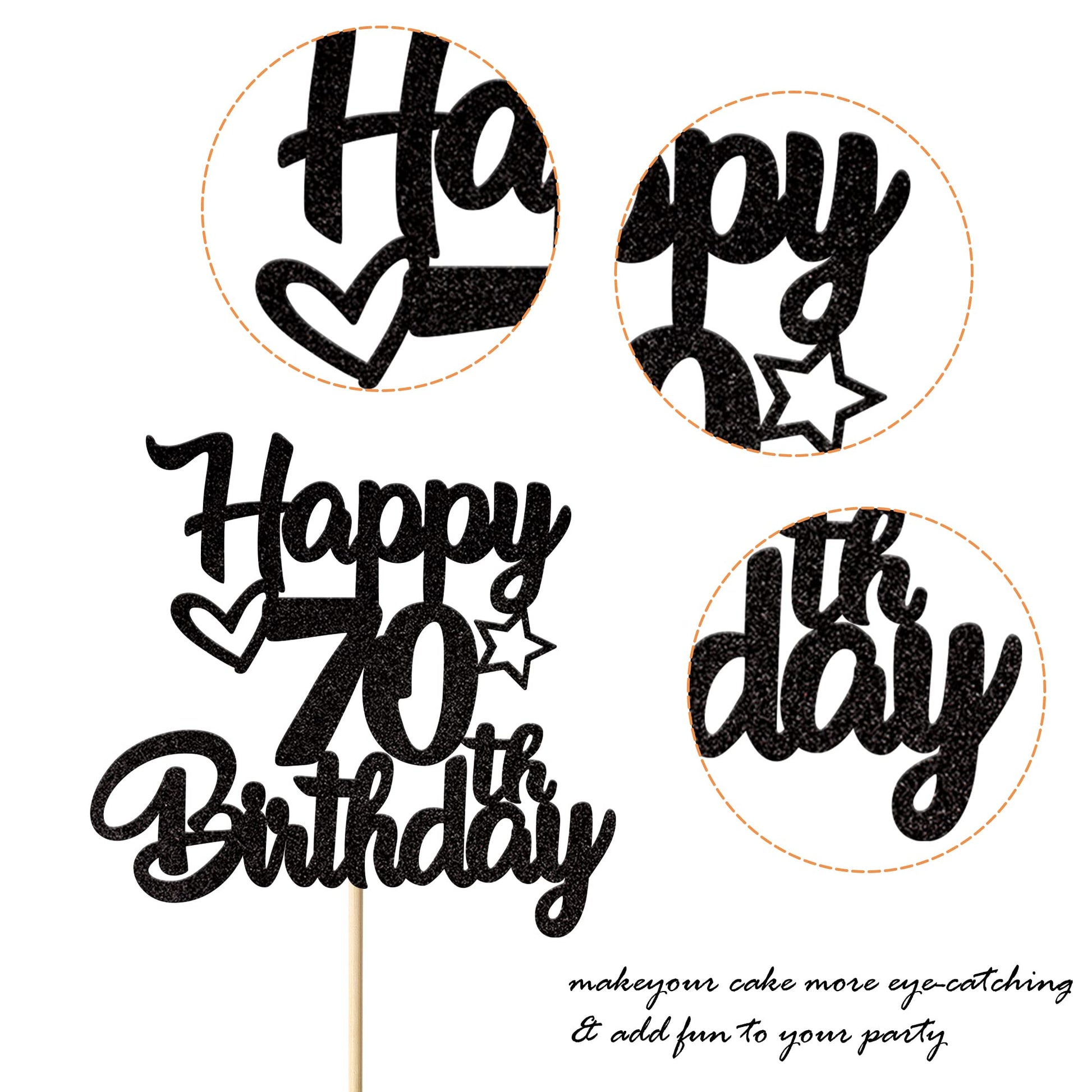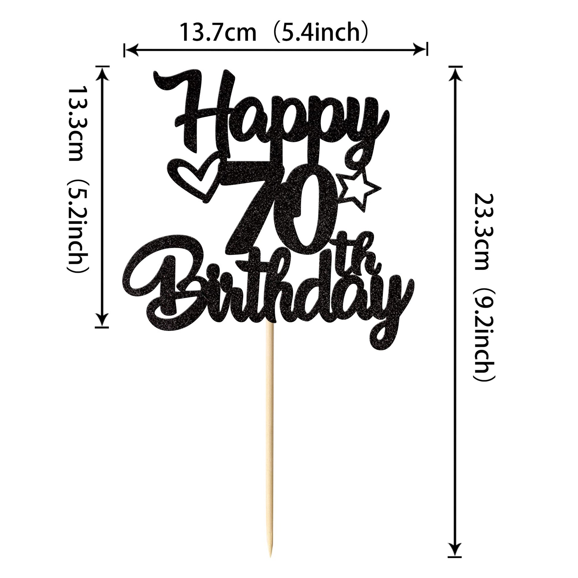 Q: What materials is the 70th birthday cake topper made from?A: The 70th birthday cake topper is crafted from high-quality single-sided glitter thick card stock, ensuring durability and a sparkling appearance.