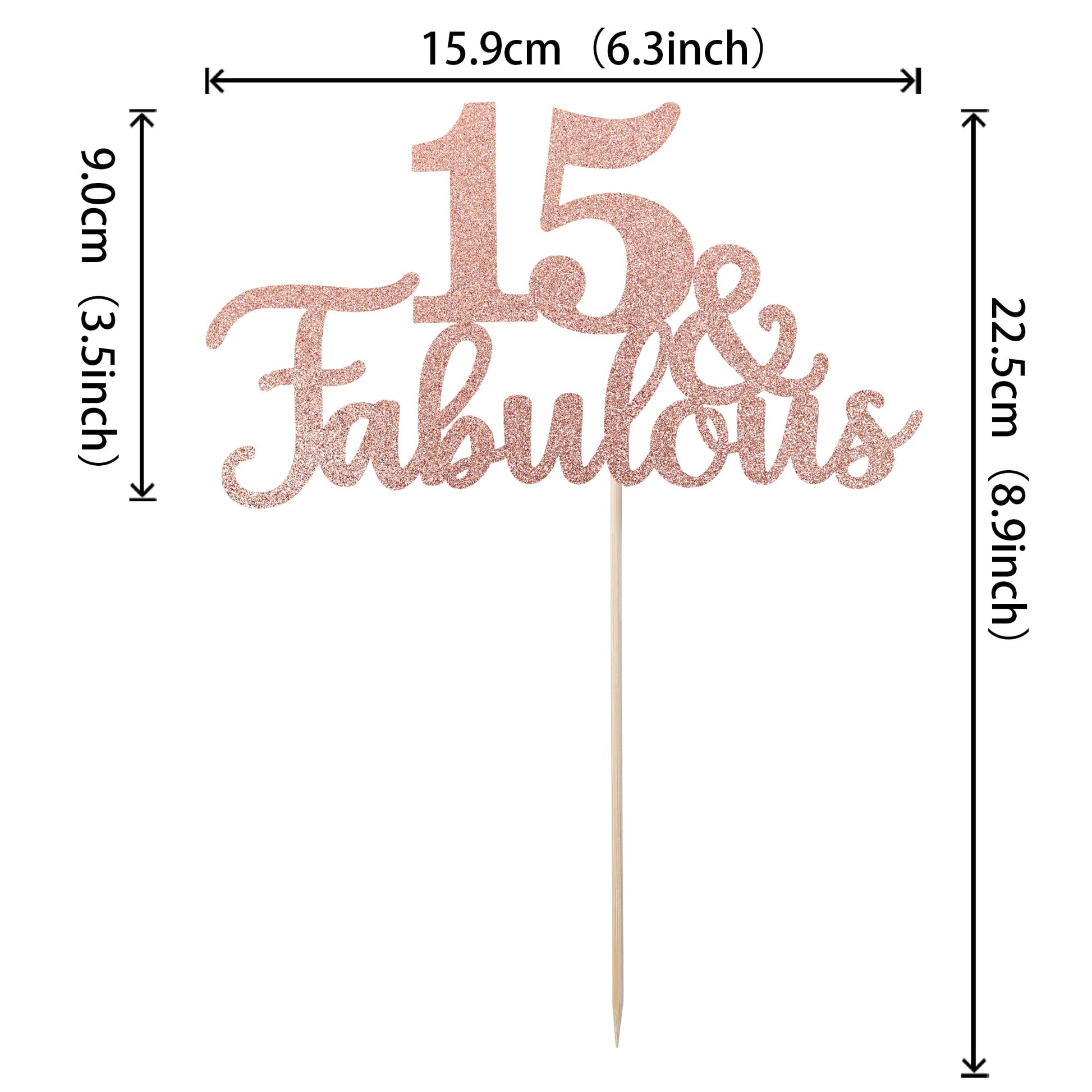 Q: What is the size of the 15 & Fabulous Cake Topper?A: The 15 & Fabulous Cake Topper measures W 6.3 inches (15.9 cm) in width and H 8.9 inches (22.5 cm) in height, including the stick.
