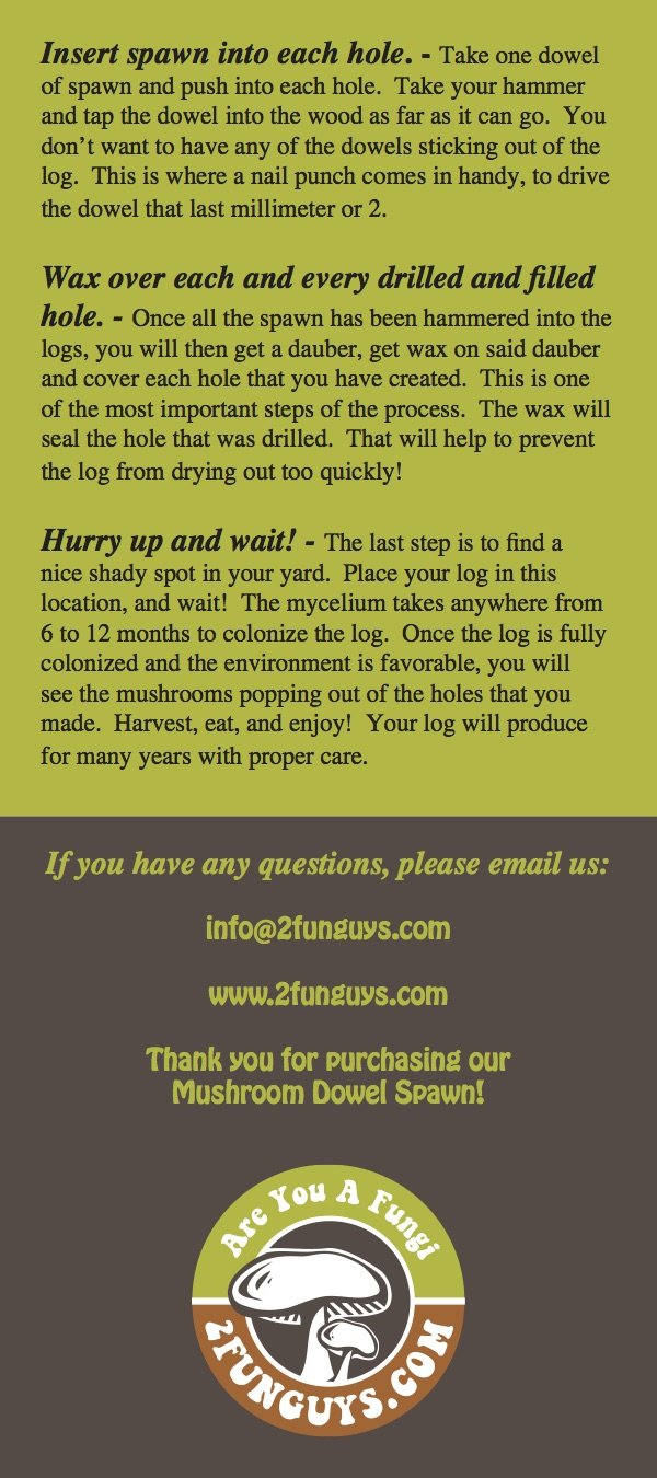 - Q: What tools do I need to inoculate logs with Shiitake Plug Spawn? A: To inoculate logs, you will need a drill with a suitable bit, the Shiitake Plug Spawn dowels, food-grade wax for sealing, and optionally a hammer to tap in the plugs. Detailed instructions are often provided with the spawn.