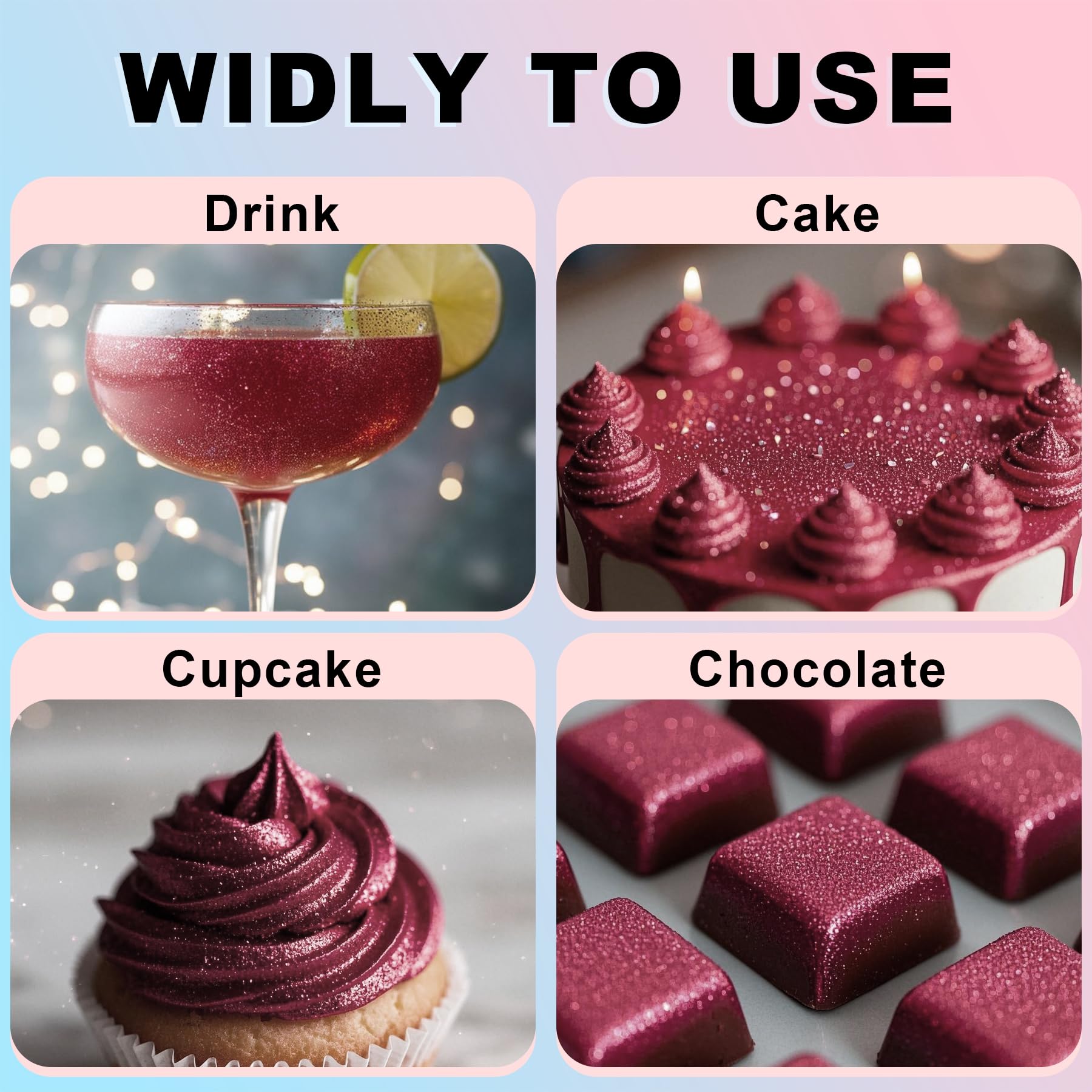 Q: What are the main uses for Red Edible Glitter?A: Red edible glitter can be used for a variety of applications including decorating drinks, cocktails, cakes, cookies, chocolates, strawberries, and other food items. It adds a magical shimmer to beverages and baked goods, making them visually appealing for events and celebrations.