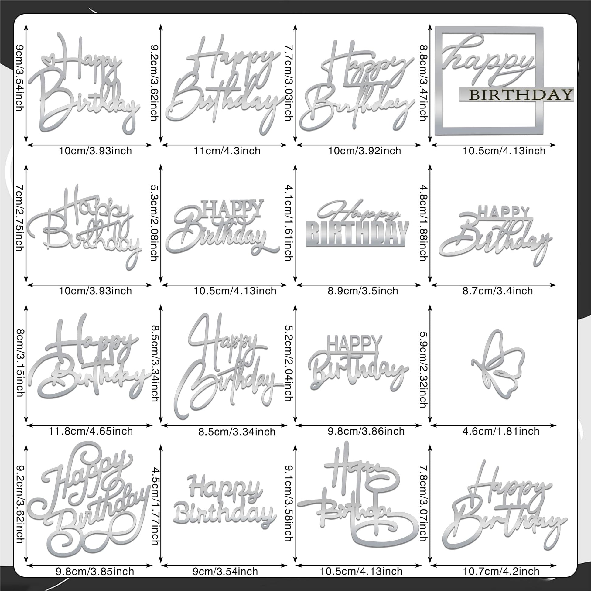 Q: What materials are used in the cake toppers?A: The 15 PCS Silver Happy Birthday Cake Toppers are made of high-quality acrylic, which ensures durability and a stylish appearance.