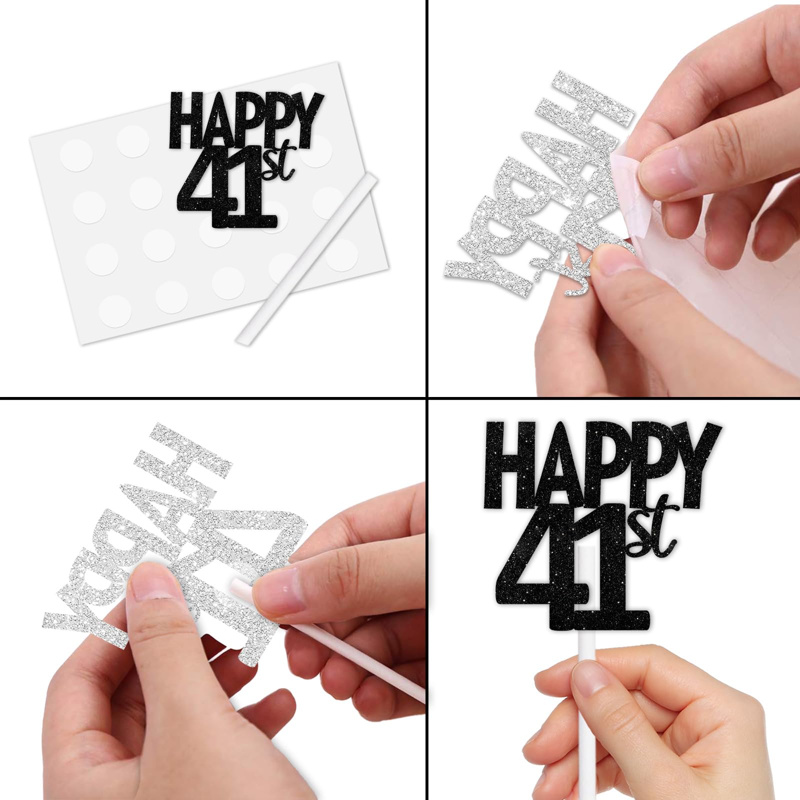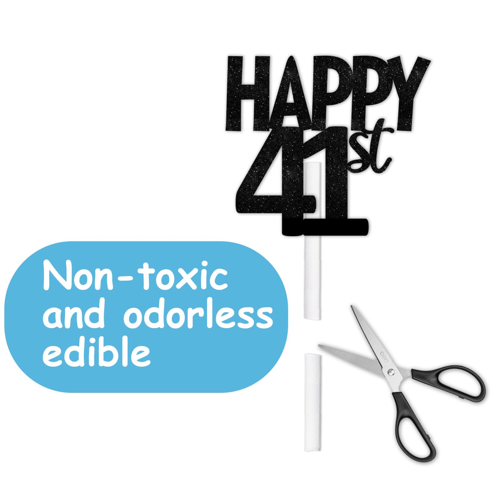 Q: What are the dimensions of the 18pcs Black Glitter Happy 41st Dessert Cupcake Topper?A: Each cupcake topper measures approximately 2.0 x 2.0 inches, making it a perfect fit for most standard-sized cakes and cupcakes.