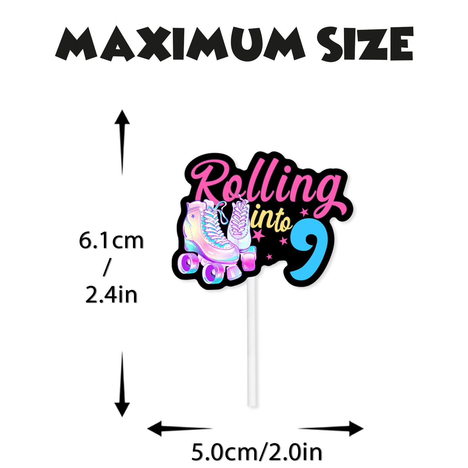 Q: What are the dimensions of the roller skates cupcake toppers?A: The roller skates cupcake toppers are 2.4 x 2.0 inches in size, making them perfect for most standard cupcakes.