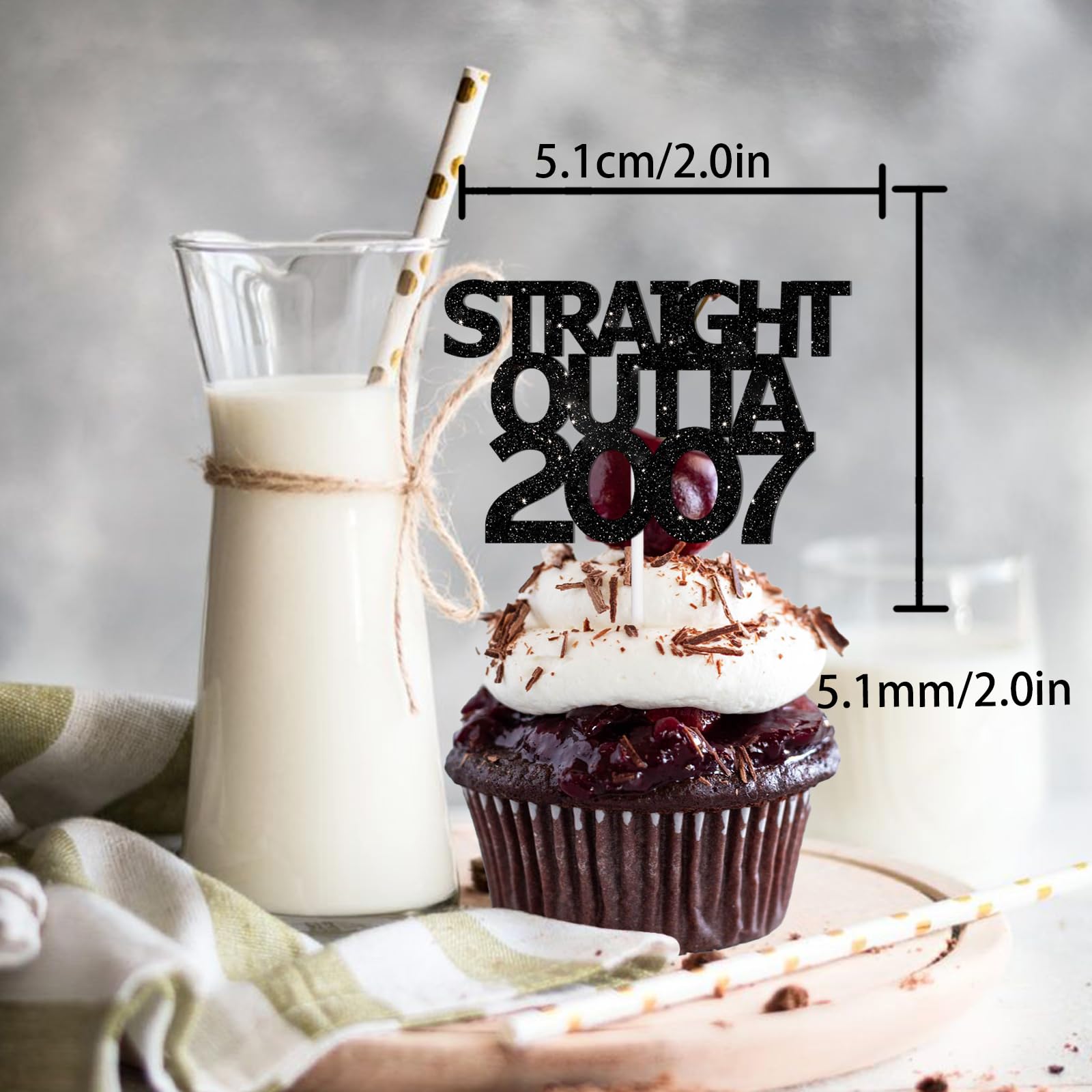 Q: Are these cupcake toppers suitable for all types of birthday celebrations?A: Yes, these glittering cupcake toppers are designed to complement various birthday themes, including the 'Straight Outta 2008' theme, making them ideal for a 17th birthday party.
