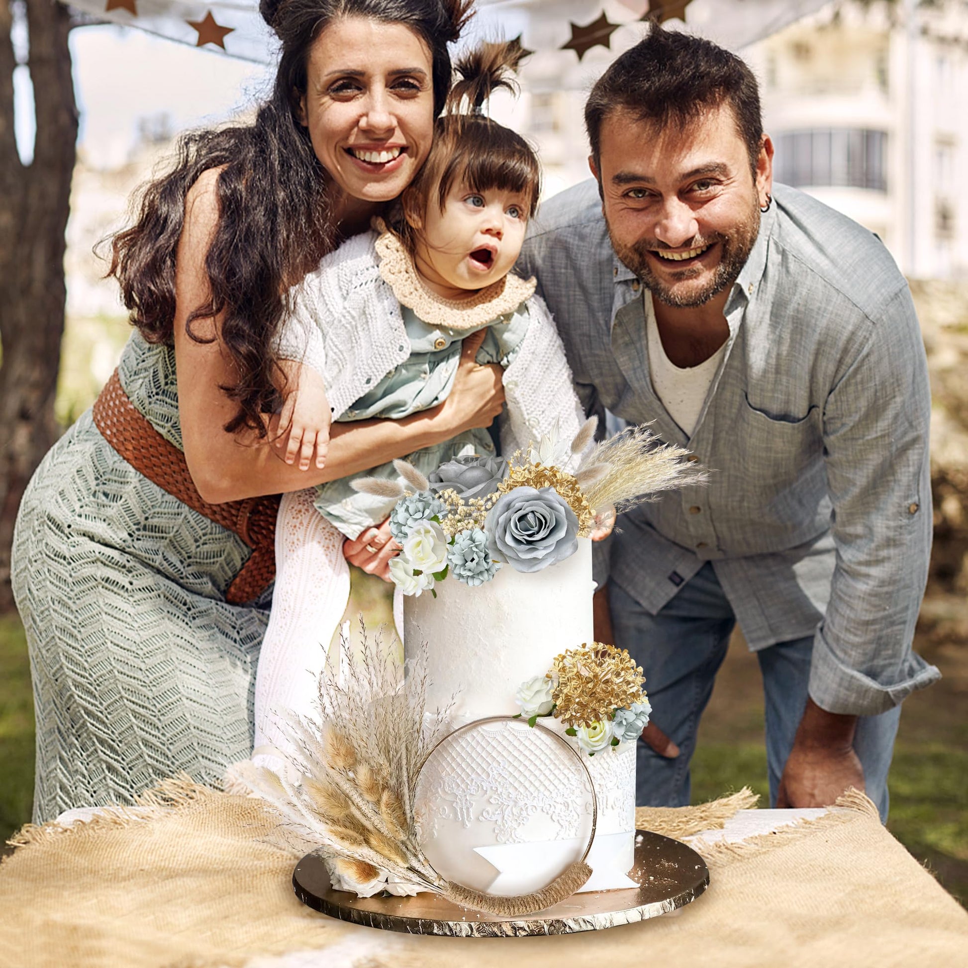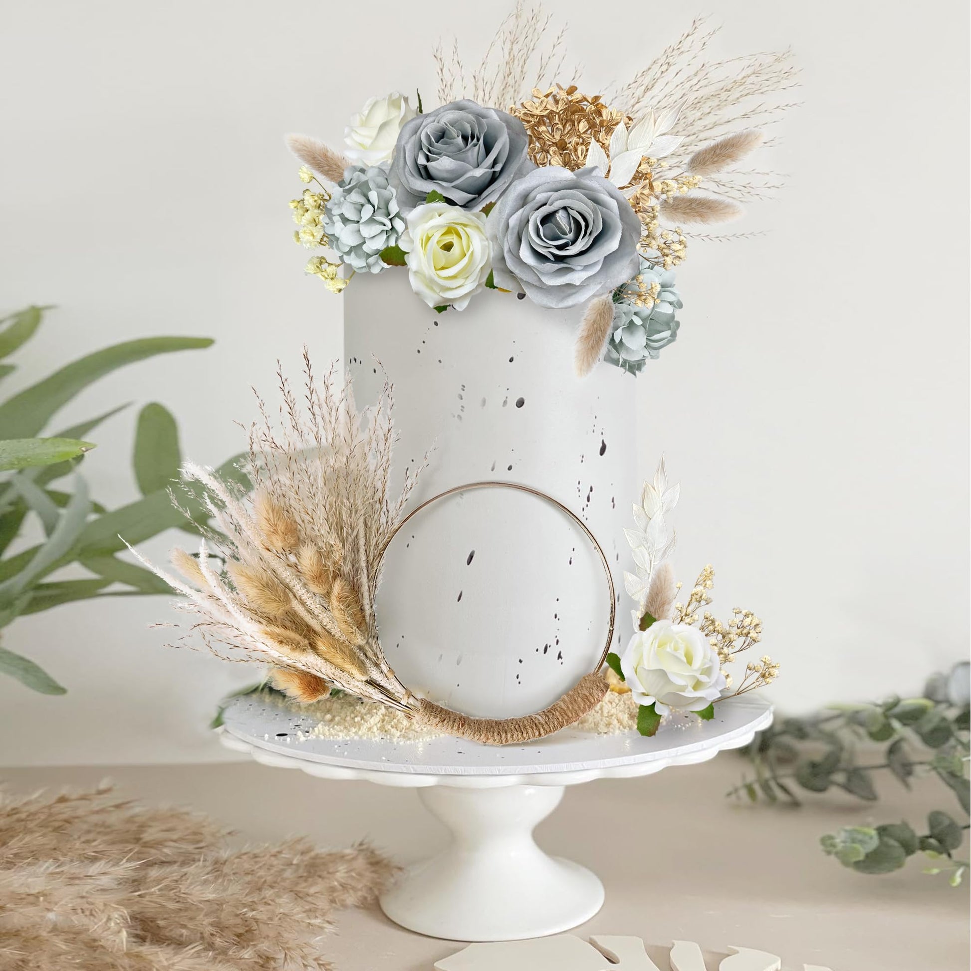 • Q: What materials are used in the Gray Boho Cake Decorations? A: The decorations are primarily made from cotton and include a variety of dried plants. This combination provides an attractive and natural look that enhances the beauty of your cake while also being suitable for home decor.