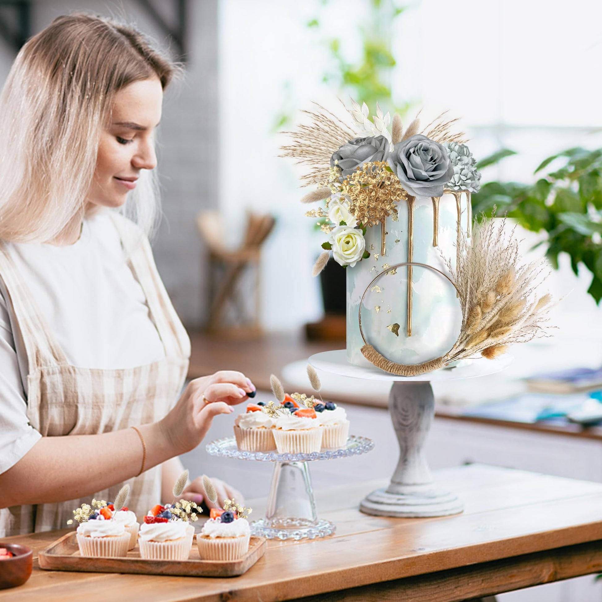 • Q: How do I care for the dried plants in the cake topper set? A: To maintain the quality of the dried plants, it's recommended to gently fluff them after unpacking, as they may become compressed during shipping. Simply leave them out for a few hours to restore their natural form. Keep them away from moisture to prevent any damage.