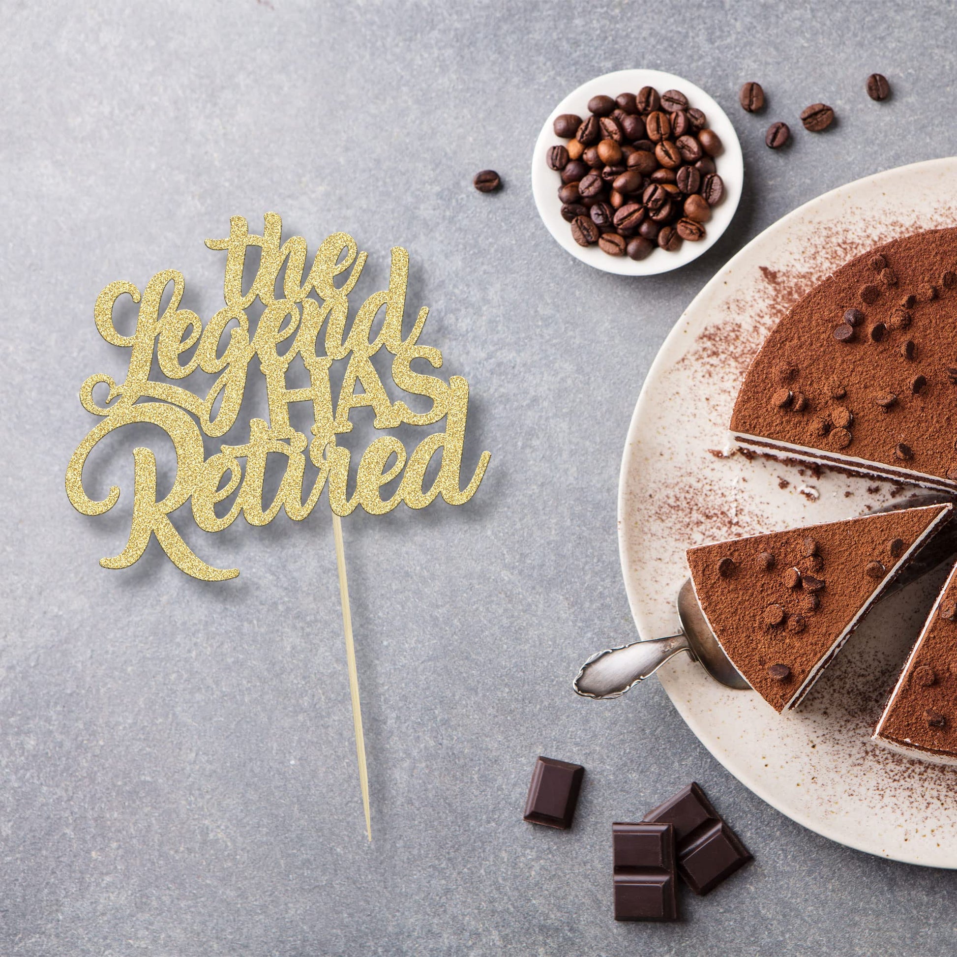 Q: What material is the Legend has Retired Cake Topper made from?A: The Legend has Retired Cake Topper is made of high-quality 300 gram glitter card stock and features a 100% food grade bamboo stick, ensuring durability and a visually appealing finish.