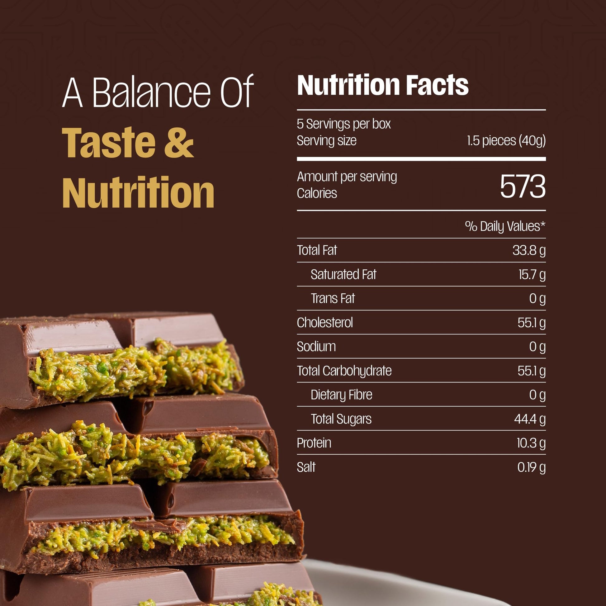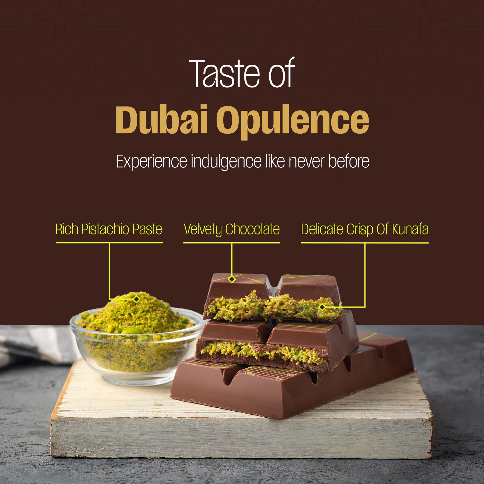 - Q: What makes the Dubai Pistachio Chocolate Bar unique? A: The Dubai Pistachio Chocolate Bar is unique due to its exquisite blend of authentic Middle Eastern flavors. It features a creamy pistachio filling wrapped in crispy kataifi strands, all coated in premium chocolate, creating a satisfying texture and rich taste that stands out among traditional chocolate bars.
