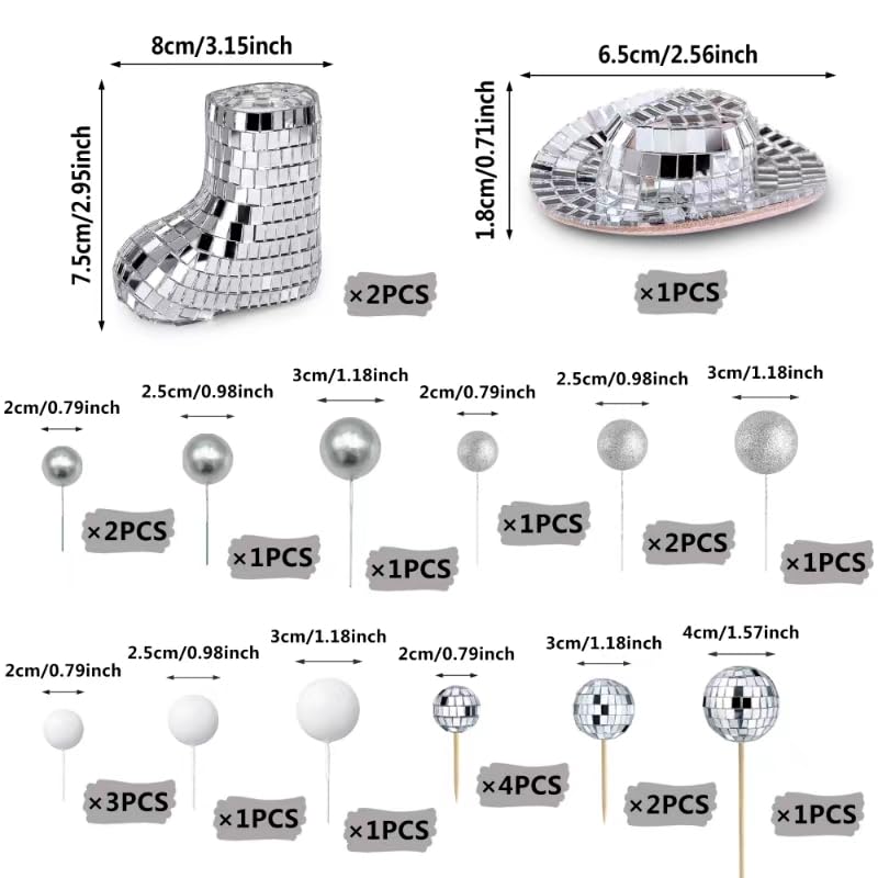 Q: What are the dimensions of the Disco Boot and Hat Cake Toppers?A: The disco boot measures approximately 3.15 x 2.95 inches, the disco hat measures about 2.56 x 0.71 inches, and the ball cake toppers vary in sizes of 0.79 inch, 0.98 inch, and 1.18 inches.