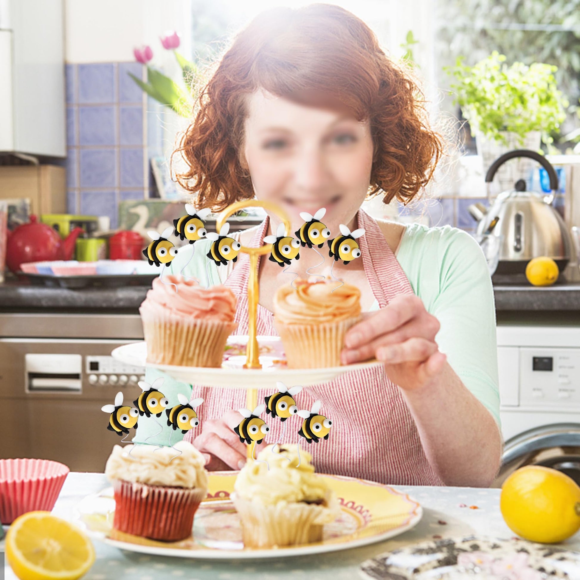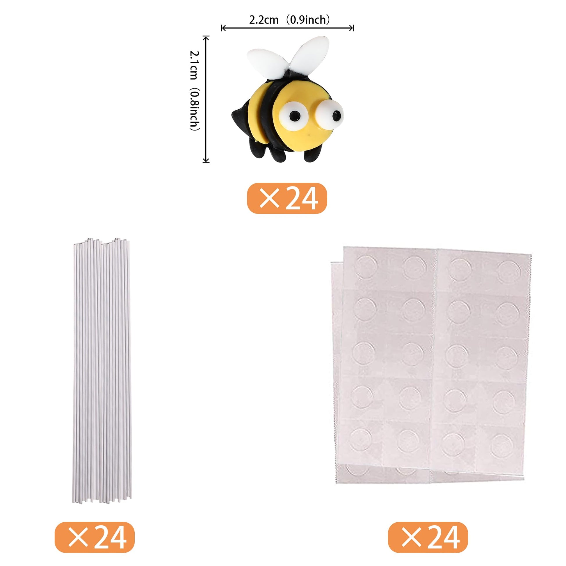 Q: How many cupcake toppers are included in the pack?A: Each pack includes a total of 24 Bumble Bee Cupcake Toppers, along with 24 glue dots and 24 iron wires for easy assembly.