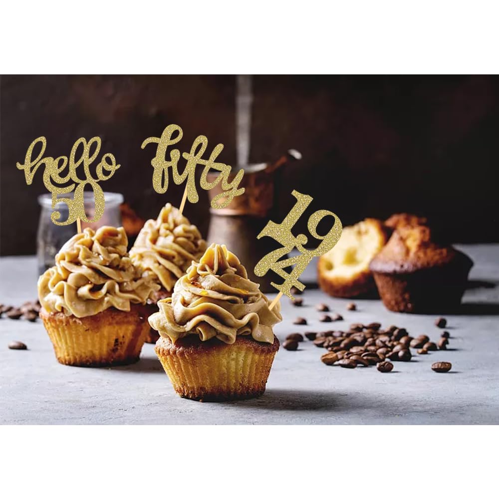 Q: How many cupcake toppers are included in the package?A: The package includes a total of 24 cupcake toppers: 8 pieces each of '1975', 'Fifty', and 'hello 50' designs.