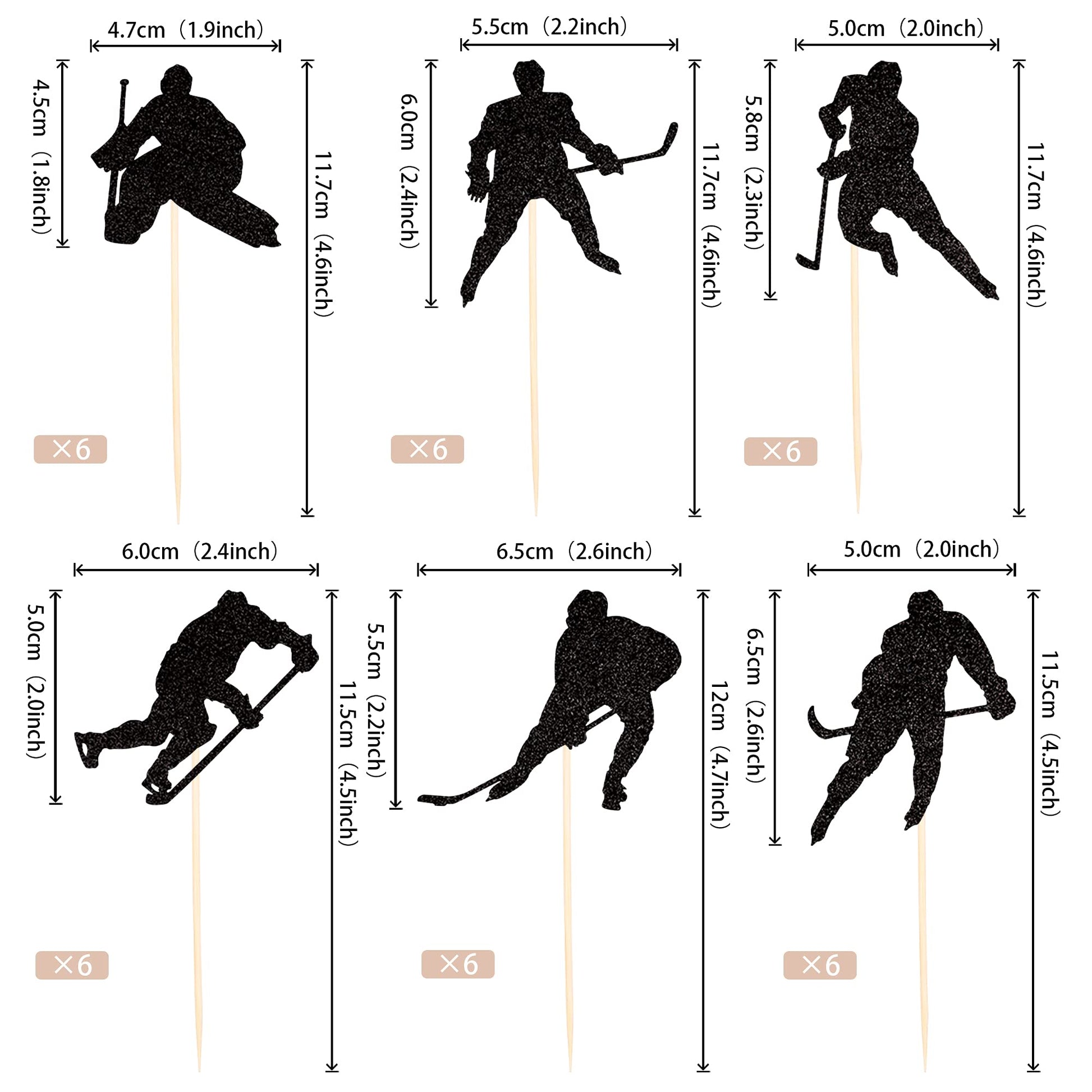 Q: What are the dimensions of the hockey cupcake toppers?A: The hockey cupcake toppers come in various sizes: 1.9*4.6 inch, 2.2*4.6 inch, 2*4.6 inch, 2.4*4.5 inch, 2.6*4.7 inch, and 2*4.5 inch (with stick).