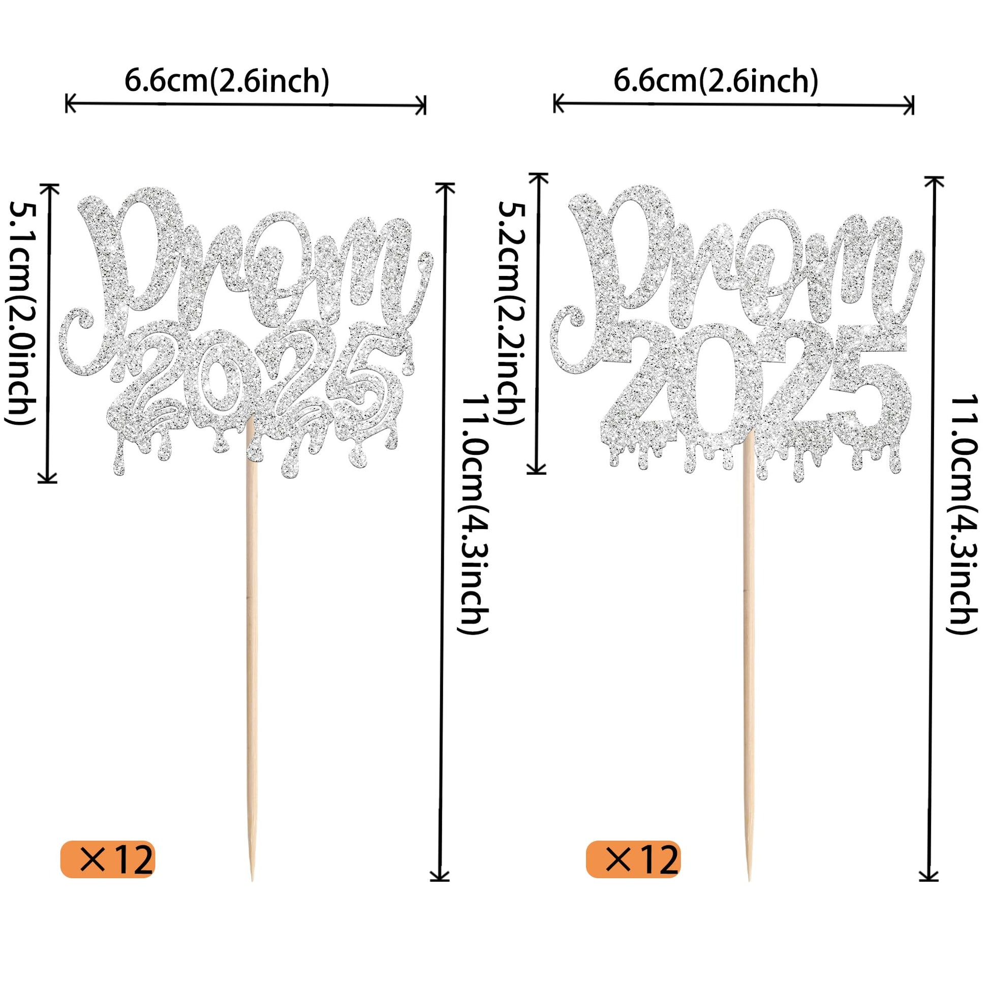 Q: What are the dimensions of the 24 PCS Prom 2025 Cupcake Toppers?A: The cupcake toppers measure 2.6 inches by 4.3 inches, including the stick.