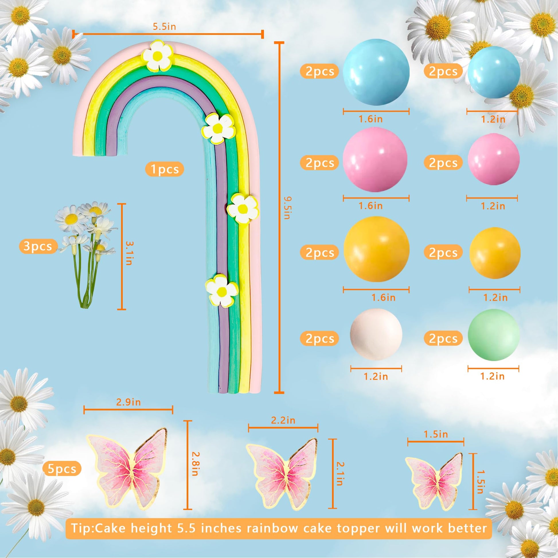 Q: What size cakes can these toppers be used on?A: The rainbow cake topper is designed for cakes that are 5.5 inches tall and above, making it ideal for most standard-sized cakes.