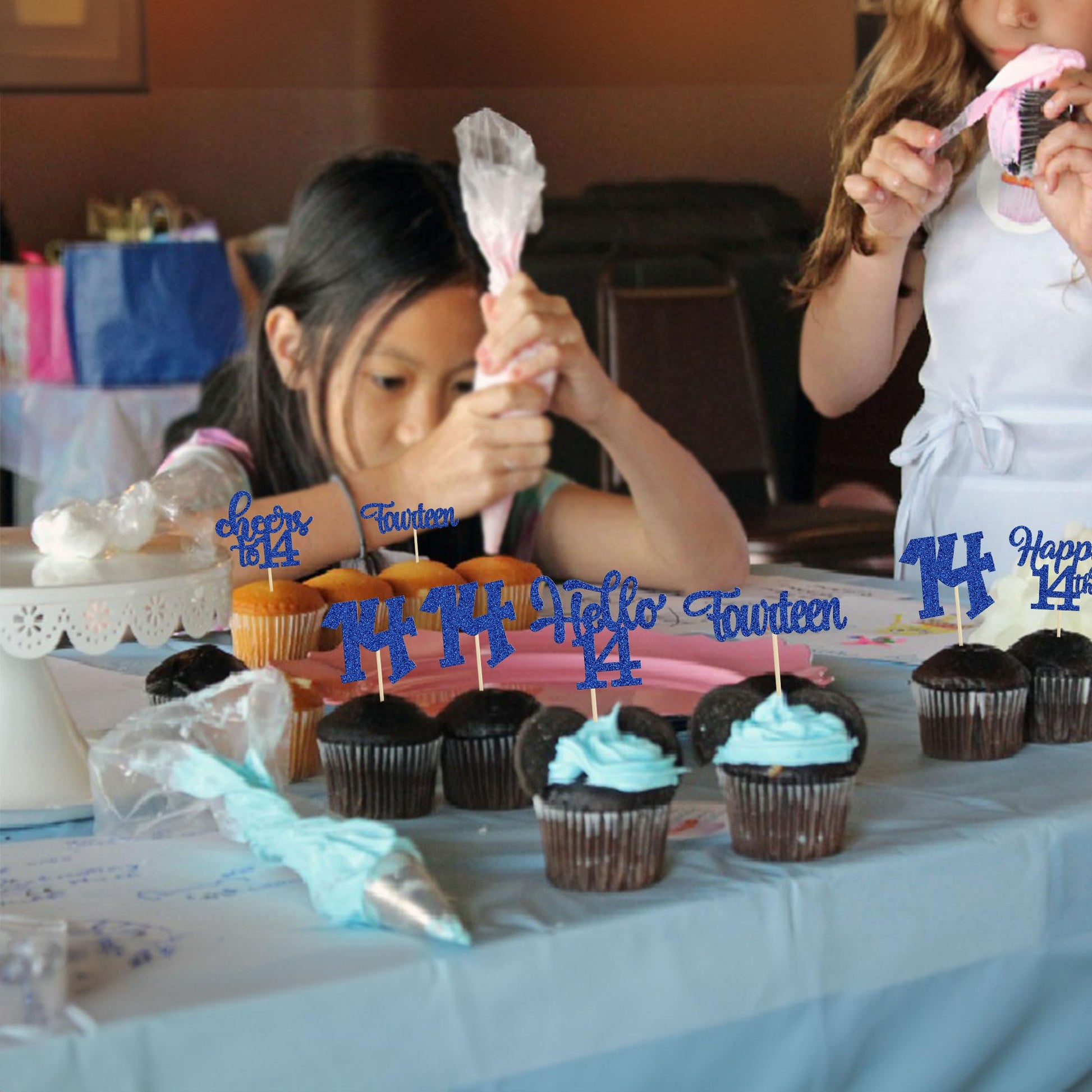 Q: What are the dimensions of the 14th birthday cupcake toppers?A: The cupcake toppers measure 2.4 inches in width and 4.7 inches in height, including the stick, making them perfect for decorating cakes and cupcakes.