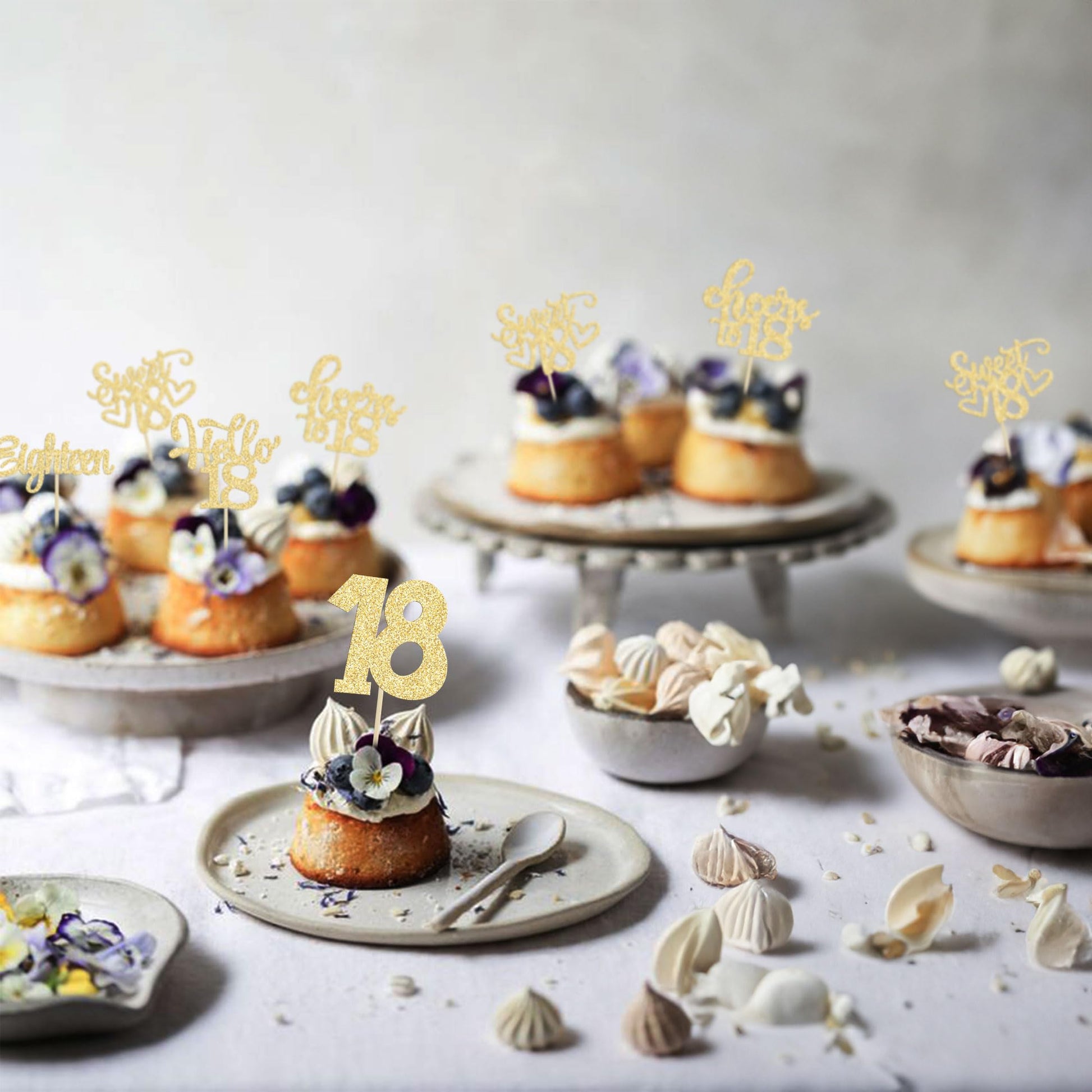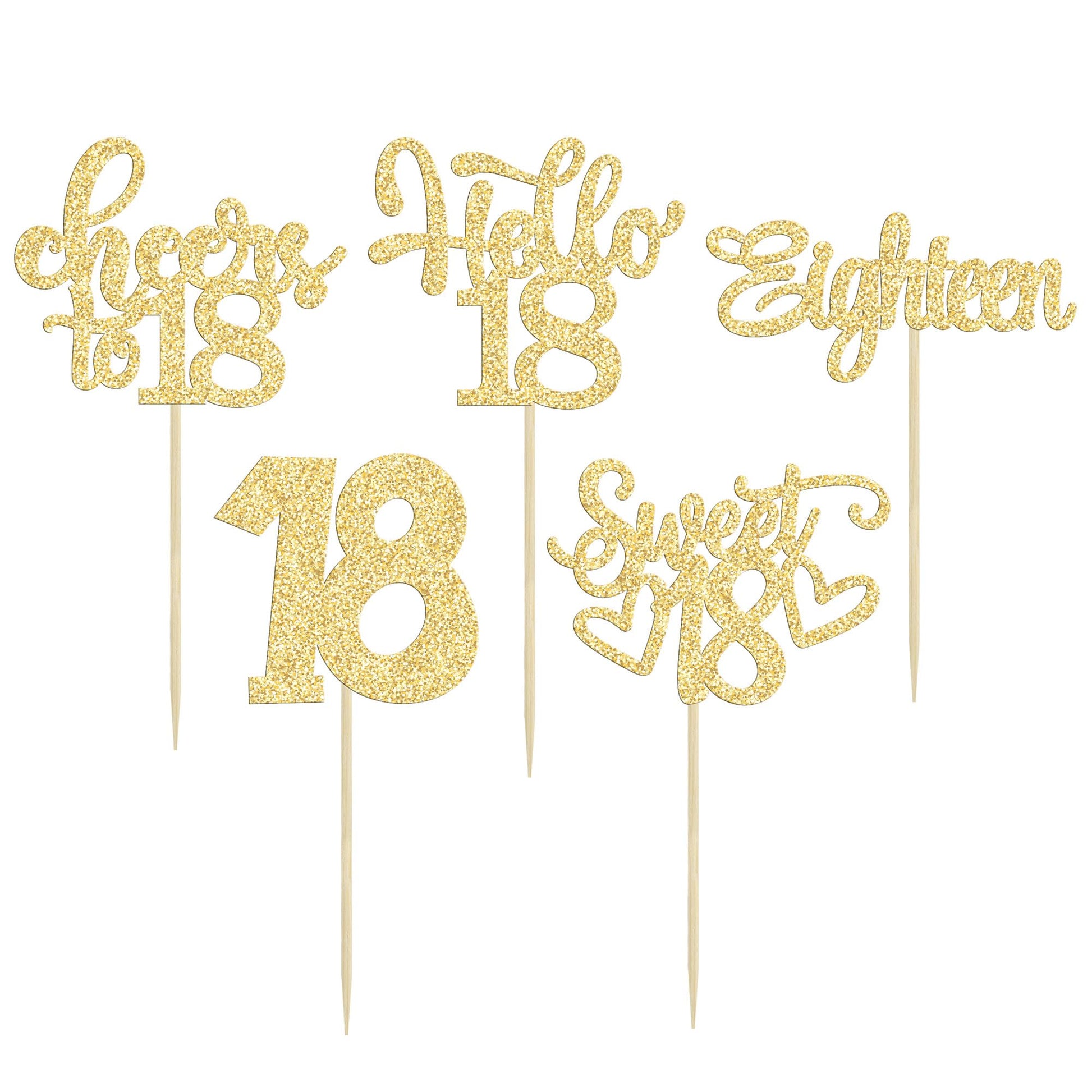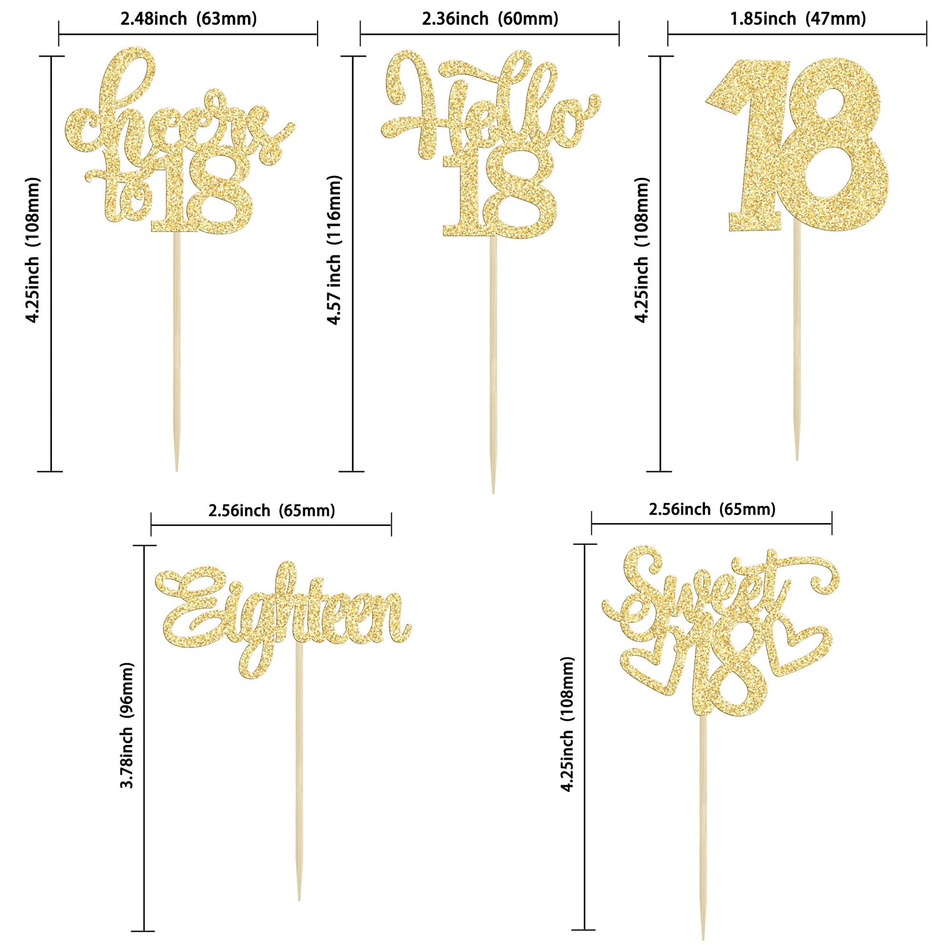 Q: What are the dimensions of the 18th birthday cupcake toppers?A: Each cupcake topper measures approximately 2.4 inches in width and 4.7 inches in height, including the stick.
