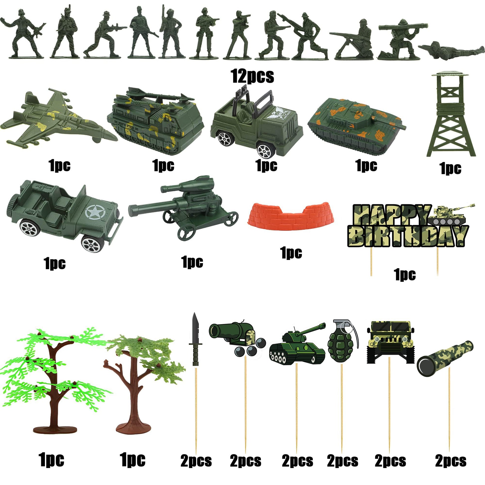 Q: How many pieces are included in the camouflage cake toppers set?A: The camouflage cake toppers set includes a total of 35 pieces, which features 12 cupcake toppers, 1 happy birthday cake topper, 2 model trees, 12 army men, and 8 military weapons and facilities.