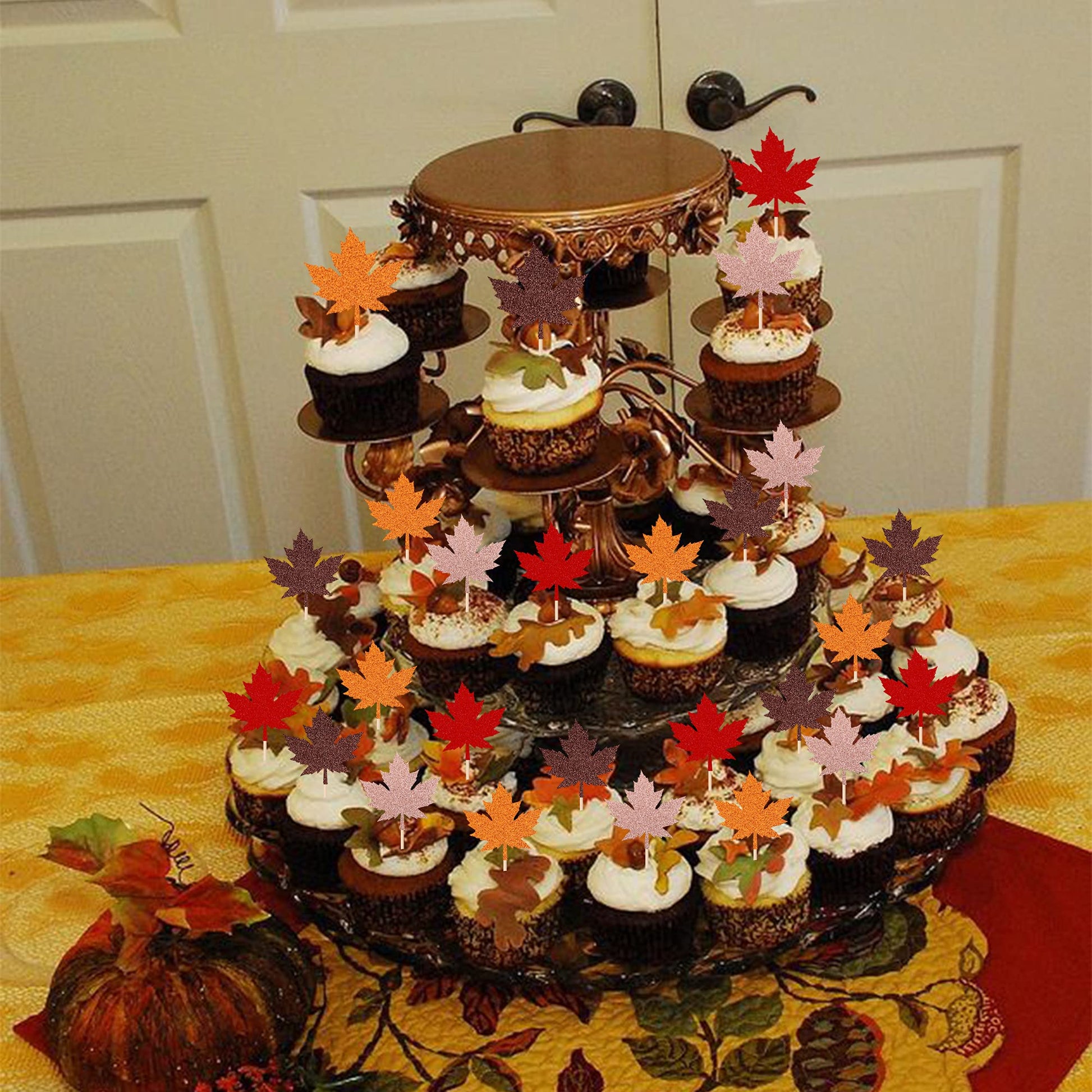 Q: What occasions are these cupcake toppers suitable for?A: These cupcake toppers are perfect for a variety of occasions, including maple leaf theme parties, fall harvest celebrations, Thanksgiving gatherings, and other festive events. Their vibrant colors and glitter design enhance the visual appeal of your desserts.