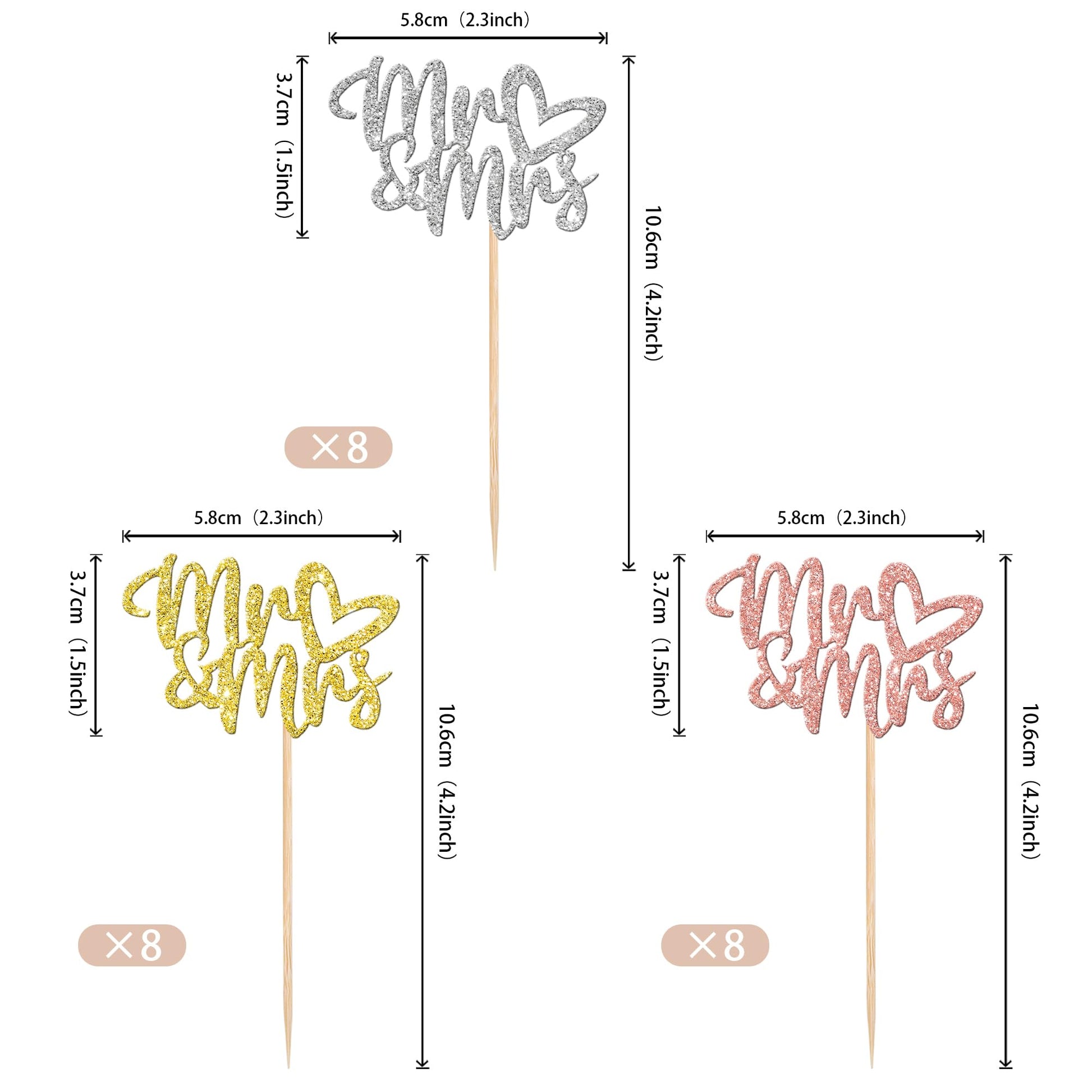Q: What are the dimensions of the Mr & Mrs cupcake toppers?A: The Mr & Mrs cupcake toppers measure 2.3 inches in width and 4.2 inches in height, including the stick.