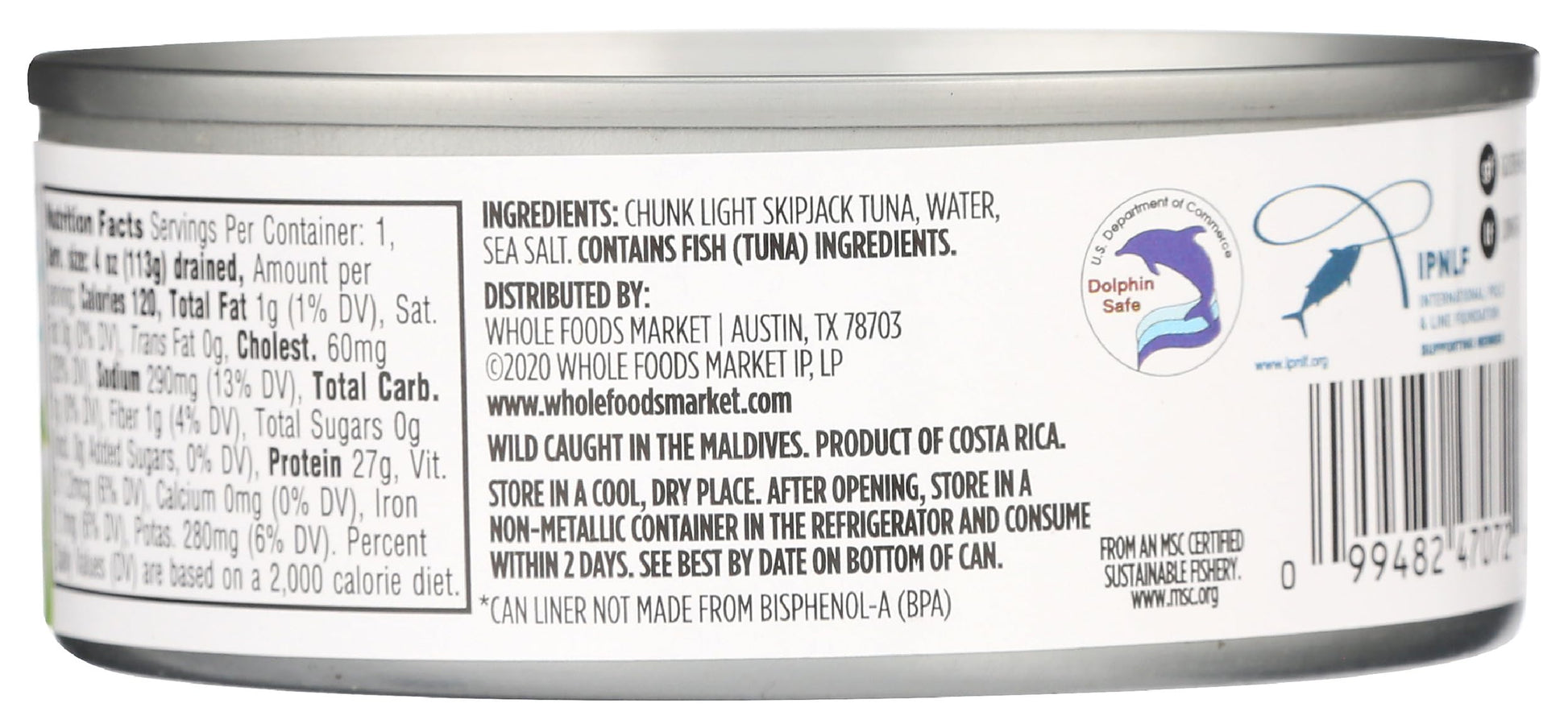 Q: What is the main ingredient in 365 by Whole Foods Market Salted Skipjack Tuna?A: The main ingredient is skipjack tuna, which is responsibly sourced and packed in water with added salt for flavor.