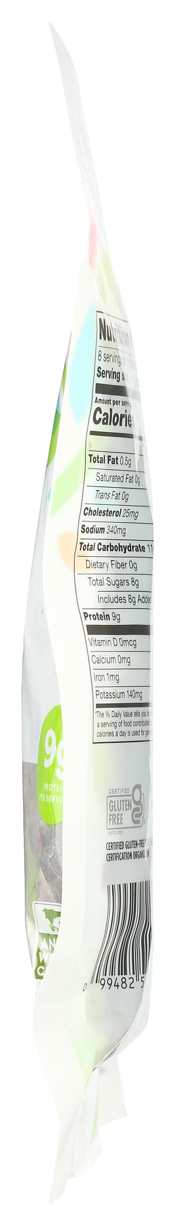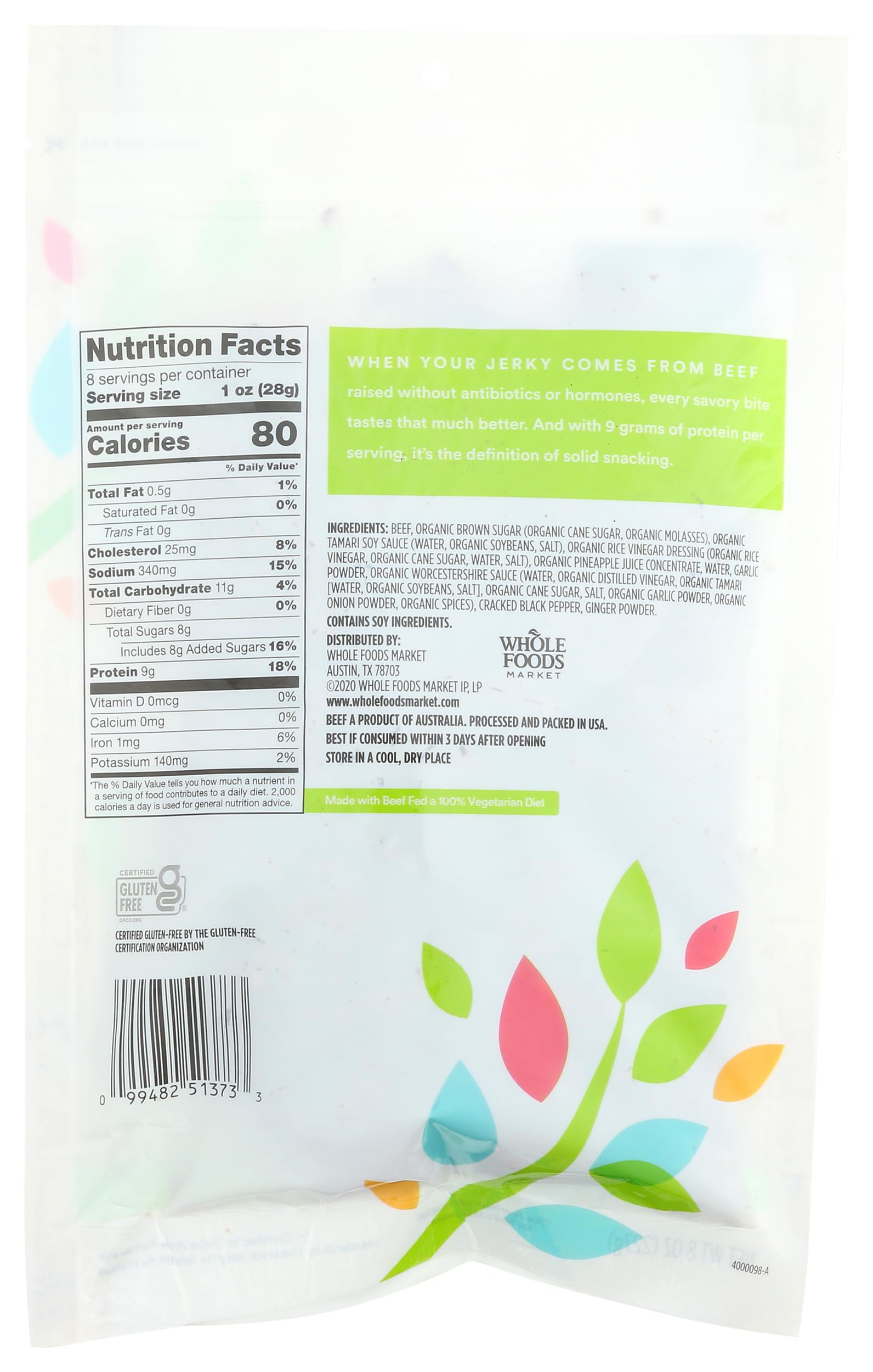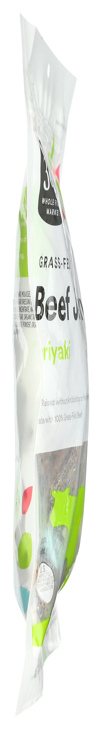 - Q: What are the nutritional benefits of 365 by Whole Foods Market Grass-Fed Beef Jerky? A: Each serving of this teriyaki-flavored beef jerky contains 9 grams of protein, making it a great source of energy and nutrients for on-the-go snacking. Additionally, it is made from beef raised without antibiotics or hormones, ensuring a cleaner protein option.