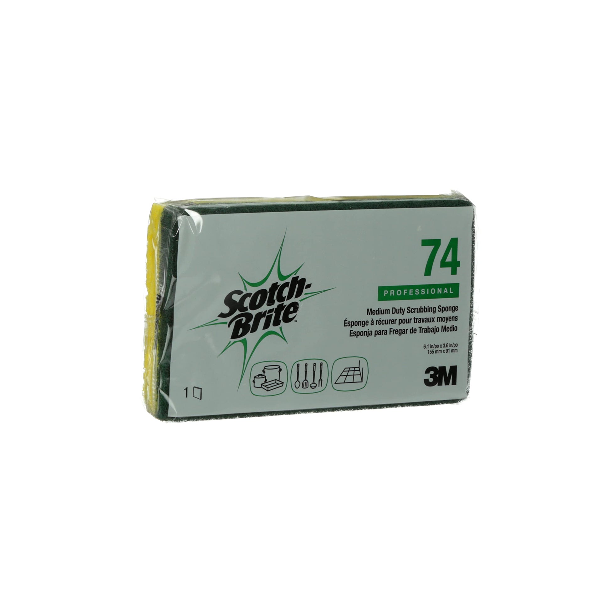 Product DescriptionDual-action cleaning tool. On one side, it’s a No. 96 scouring pad for scrubbing and cleaning. On the other side, the cellulose sponge quickly wipes up spills and messes and can carry cleaning solutions to the work surface.From the ManufacturerScotch-Brite™ Medium Duty Scrub Sponge 74, used wet or dry, is a hard-working, dual-action cleaning tool for food-service, residential and commercial use. The scouring mesh, formed of resilient synthetic fibers, is permeated with abrasive particles for long-lasting scrubbing power. Flip the scouring pad over and an absorbent cellulose sponge wipes up spills and delivers soap, water and cleaning solutions where they are needed. The handy size makes this scrubbing sponge perfect for cleaning cookware, kitchen utensils and equipment, counters and appliances, floors, stairways, walls, railings, desks and maintenance equipment.For long scrub sponge life, clean Scotch-Brite™ Medium Duty Scrub Sponge 74 after each use, rinsing excess food debris from the pad before washing in soapy water or placing in the dishwasher so both surfaces are exposed to washing. The medium duty scrub sponge is not recommended for polished or easily scratched surfaces.For more than a century, 3M has applied innovation and technology to improving our customers’ lives and supporting their business goals. Today the company, from its headquarters in St. Paul, Minnesota, serves industrial and commercial customers and consumers in nearly 200 countries. Building and Commercial Services products—a diverse category including environmental monitors, floor mats, fire barriers, and cleaning solutions—help customers maintain clean, safe, and attractive facilities. The 3M brand, across thousands of products, represents consistency, superior quality, and value.