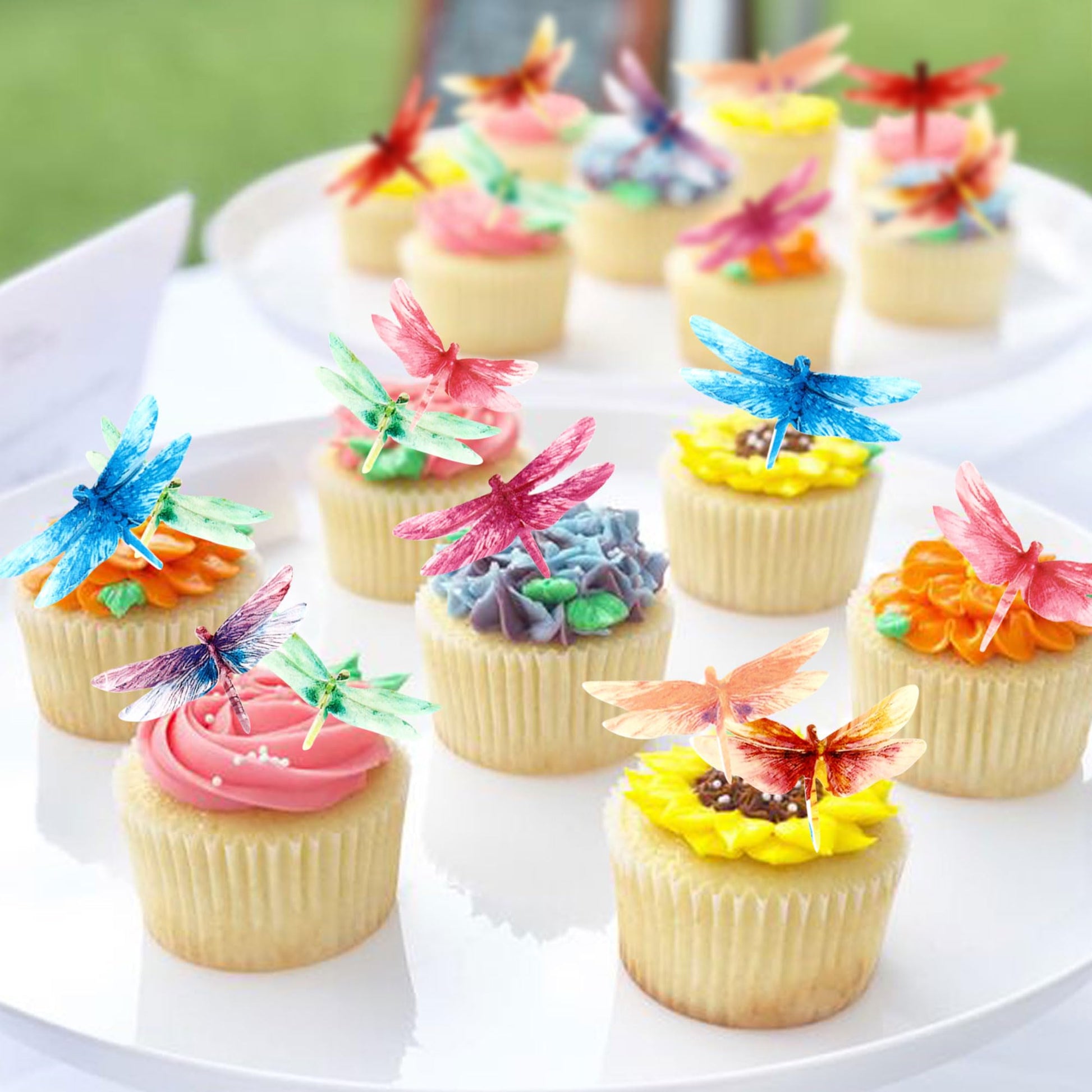Q: What are the edible dragonfly cupcake toppers made of?A: The edible dragonfly cupcake toppers are made of non-toxic, lightweight rice paper, which is safe for food use.
